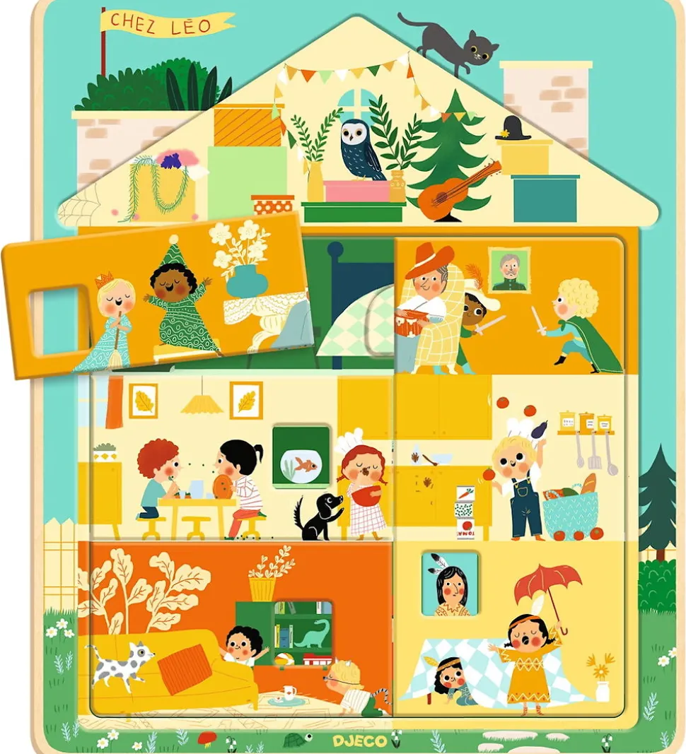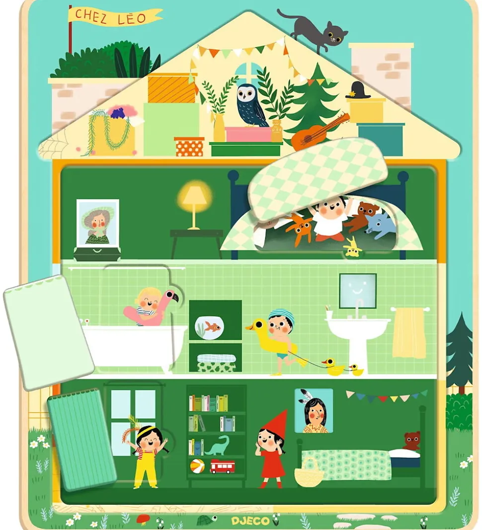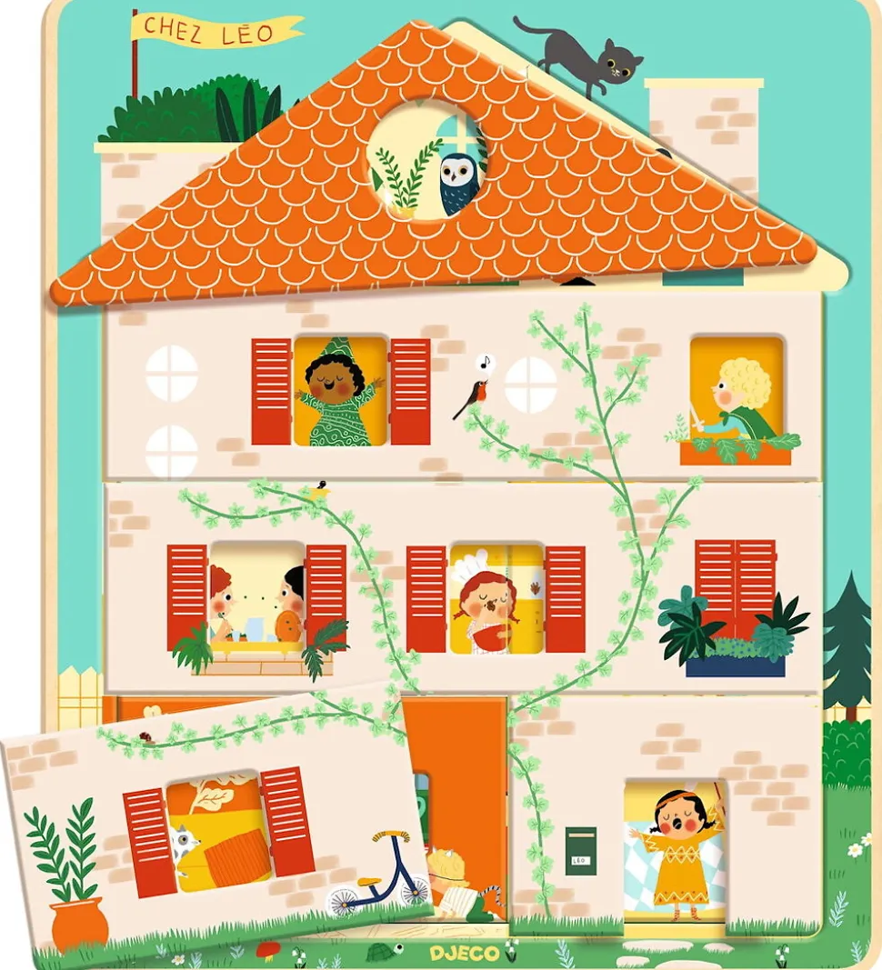 Sjovt Djeco puslespil lavet i trø og med motiv af et hus med 12 brikker, der skal lægges i tre lag på en plade.