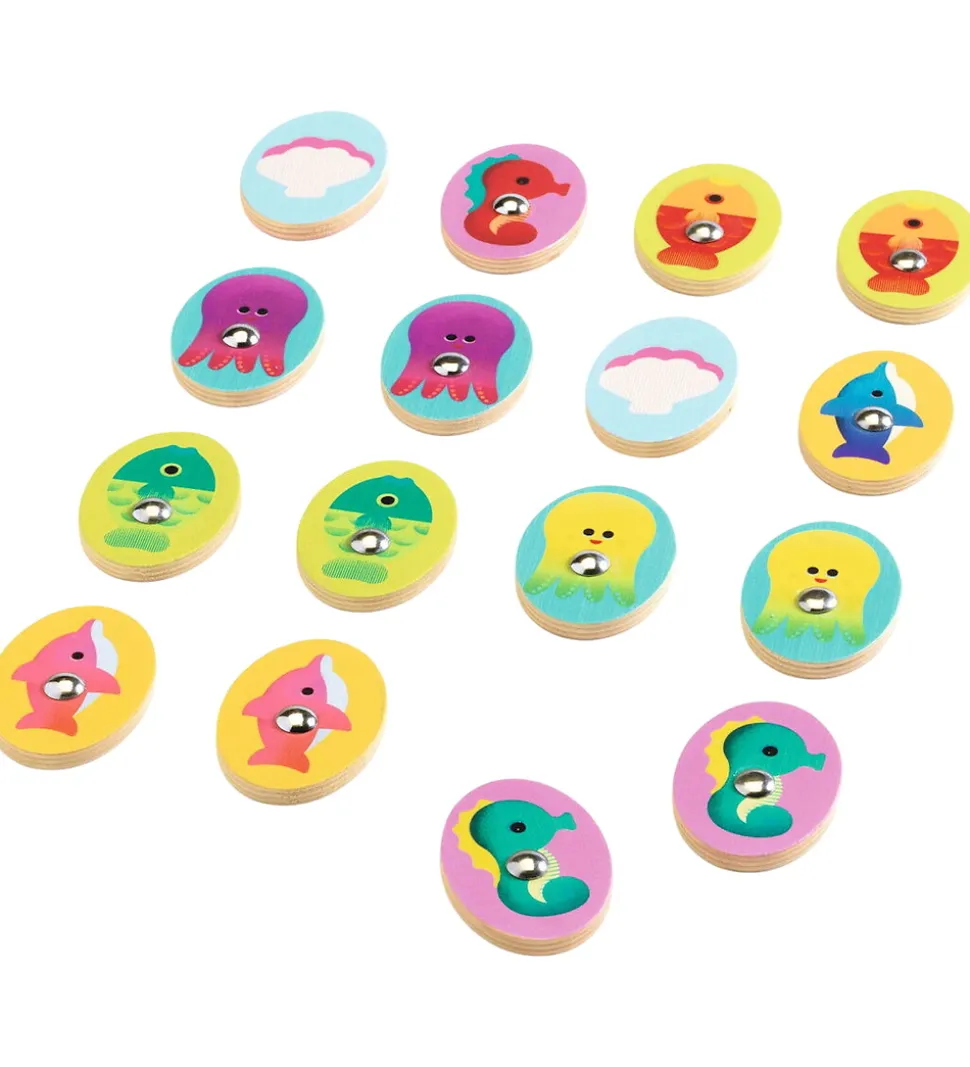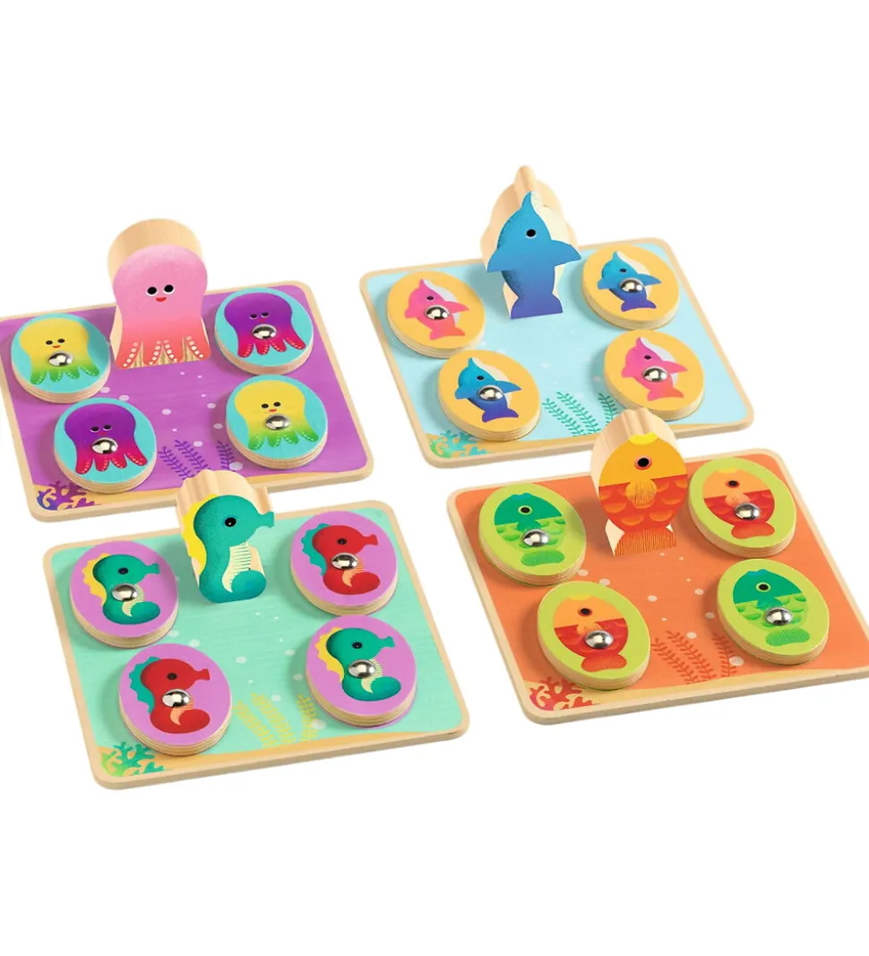 Hyggelig Djeco spilsæt i træ, som er i et fint havtema. Sættet rummer fire forskellige spil i form af:
