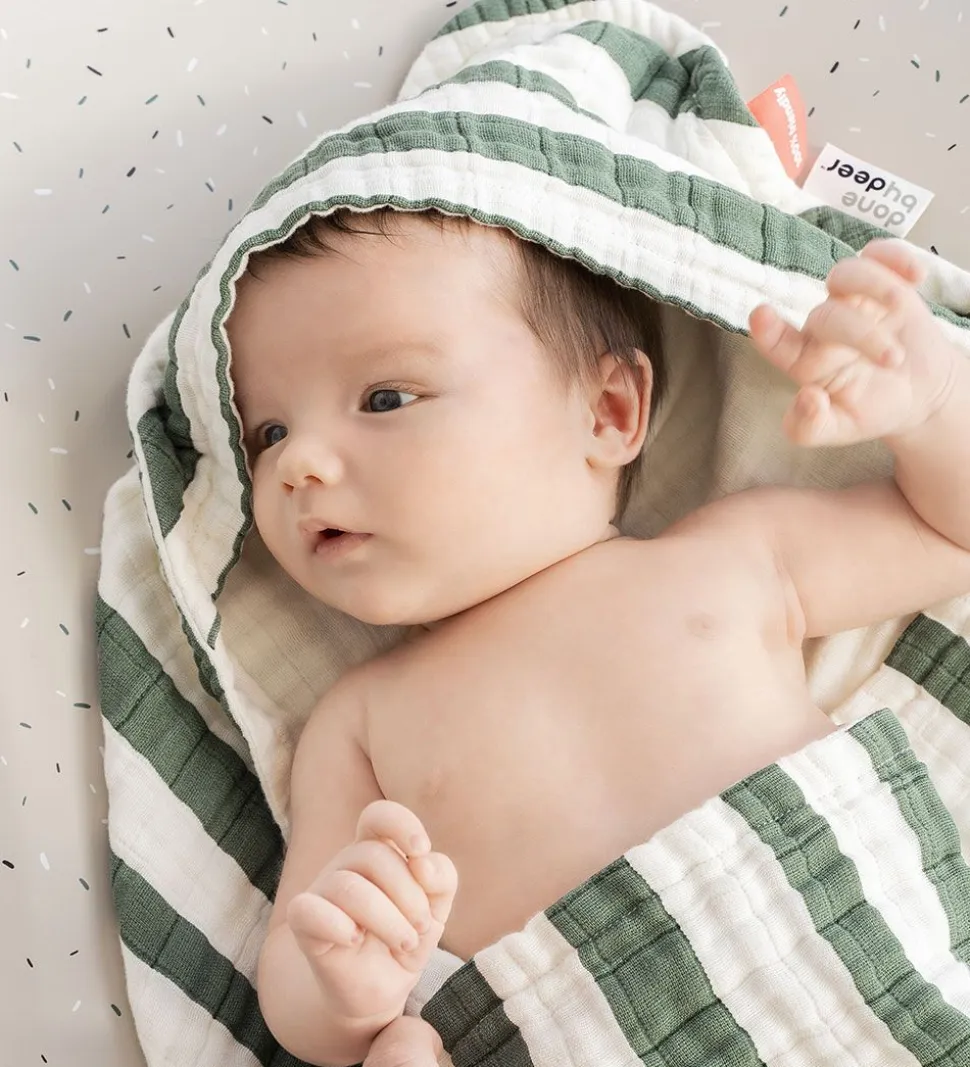 Smart Done By Deer babyhåndklæde i hvid, med brede striber i grøn. Indersiden er ensfarvet hvid.