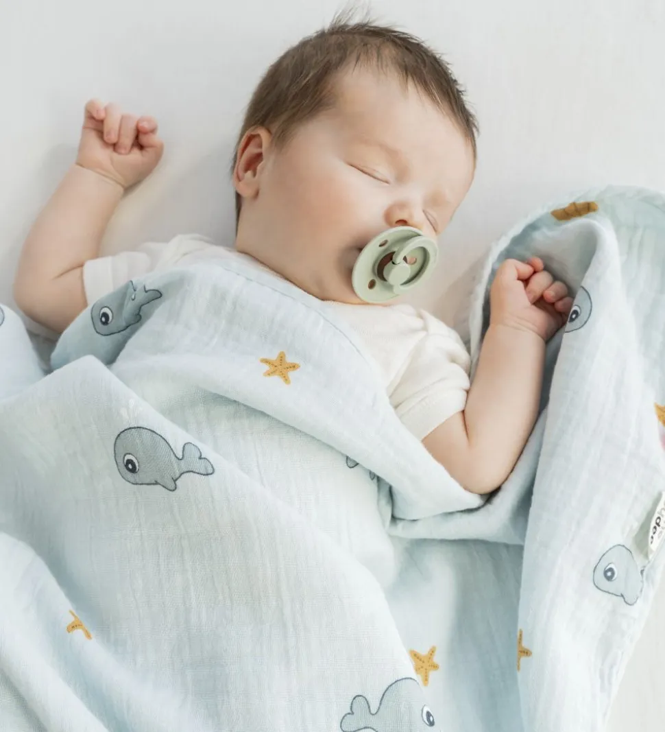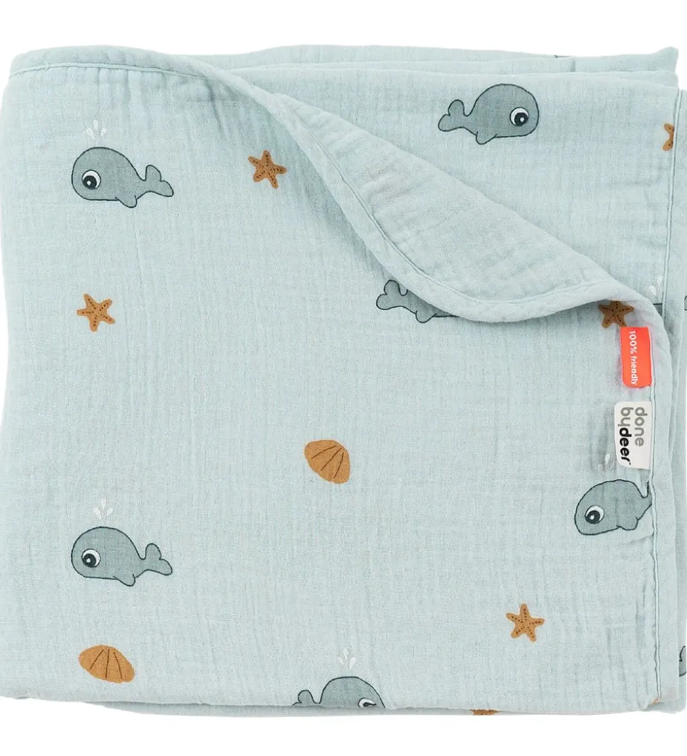 Skønt Done by Deer babytæppe i lyseblå med et allover print af søde hvaler, muslinger og søstjerner i blå og brune nuancer.