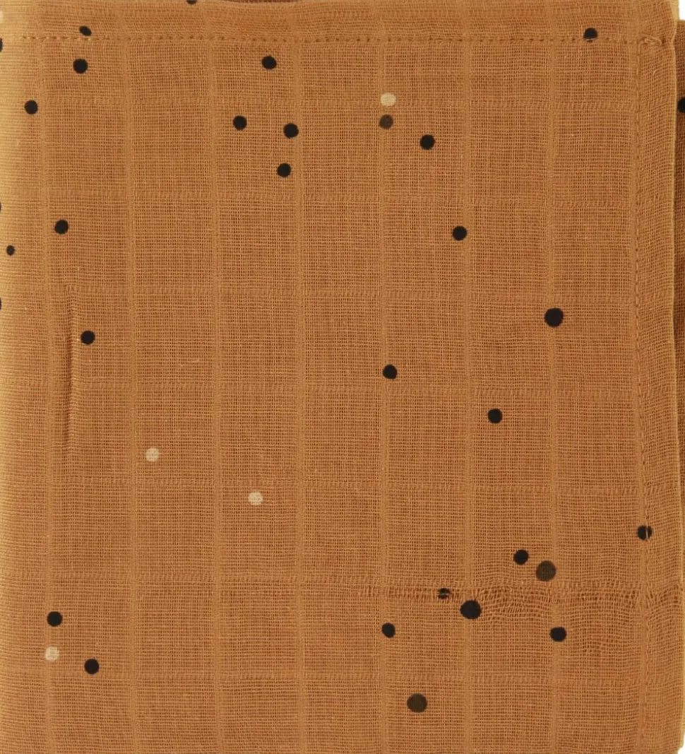 Skønne Done by Deer svøb solgt i en 2-pak med ens design i en varm karrygul farve med masser af skønne prikker i brunlige nuancer.