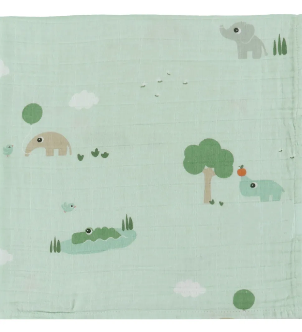 Dejlig Done by Deer babysvøb i en lyseblå nuance med et skønt print af elefanter, næsehorn og krokodiller. Done by Deer babysvøbet er kvadratisk, og er fremstillet i en blød bomuldskvalitet med musselin struktur.