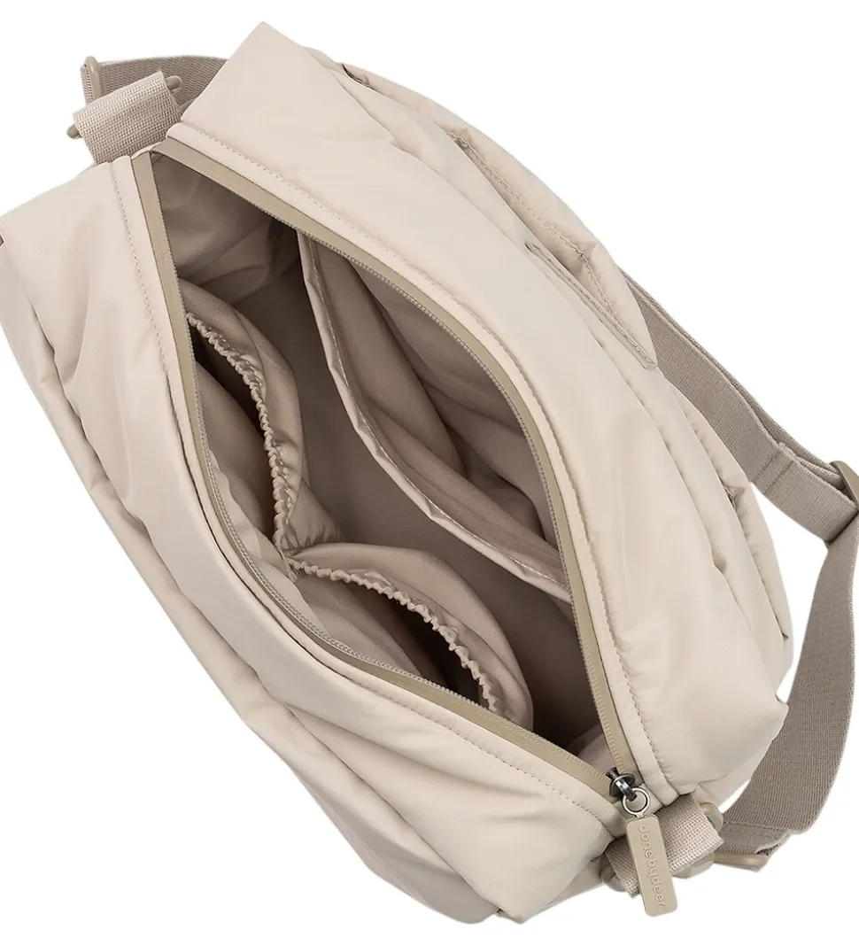 Elegant Done by Deer barnevognstaske i beige med qulitet struktur og et diskret gummilogo på fronten. Barnevognstasken har to stiklommer på forsiden, og åbnes i toppen med en lynlås. Indvendigt er der et stort rum og tre rummelige lommer i siderne. Der medfølger en aftagelig og justerbare skulderrem, samt to remme som kan sættes omkring styret på barnevognen med velcro.