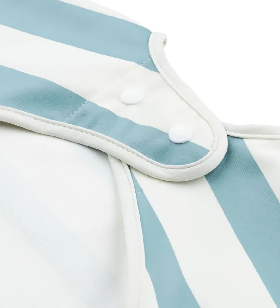 Done By Deer hagesmækken har lange ærmer med smalle elastikkanter, og den lukkes i nakken med to trykknapper. I bunden er der en spildlomme, der opsamler madkrummer. Hagesmækken har en PU coating, der gør den vandtæt og nem at tørre af.