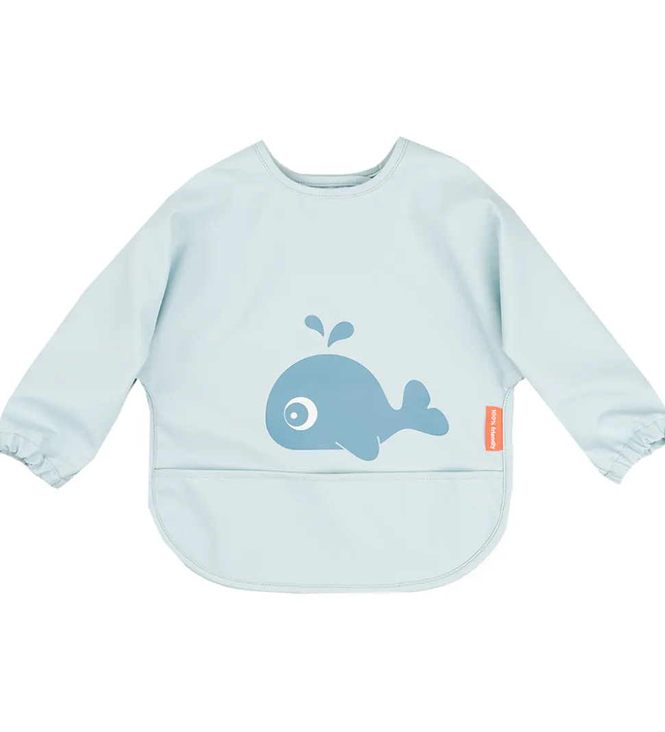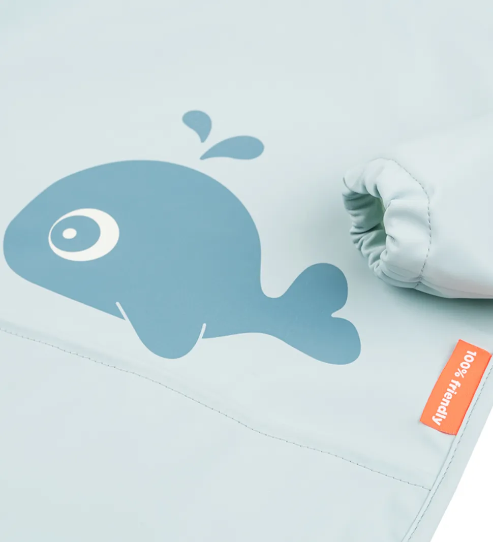 Sødt Done By Deer forklæde i lyseblå med et print af en hvalen Wally.
