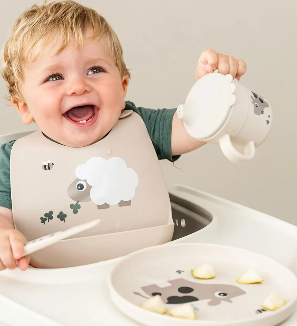 Done by Deer hagesmækken er i en lækker silikone kvalitet og kan lukkes i nakken med dobbelt lukning og kan justeres i længden. I bunden er der en spildlomme, der opsamler madkrummer.