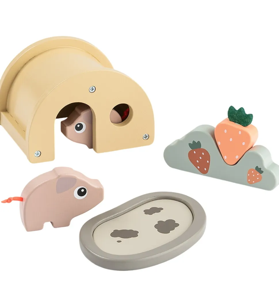 Underholdende Done by Deer legetøj bestående af et grisehus med to grise, en mudderpøl og en jordbærdplante med et jordbær. Grisehuset har en åbning og et vindue, så grisene kan gå ind i huset og kigge ud. Legetøjet er malet i fine farver og indbyder til kreative lege.