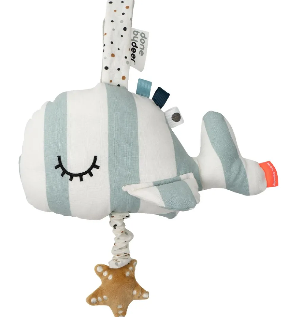 Done by Deer musikdyret har et åbent øje på den ene side og et sovende øje på det andet. Træk i den bløde stjerne fisk i bunden, for at høre den søde melodi spille. Bamsen kan let hænges fast hvor end det ønskes, med den praktiske velcrostrop i toppen.