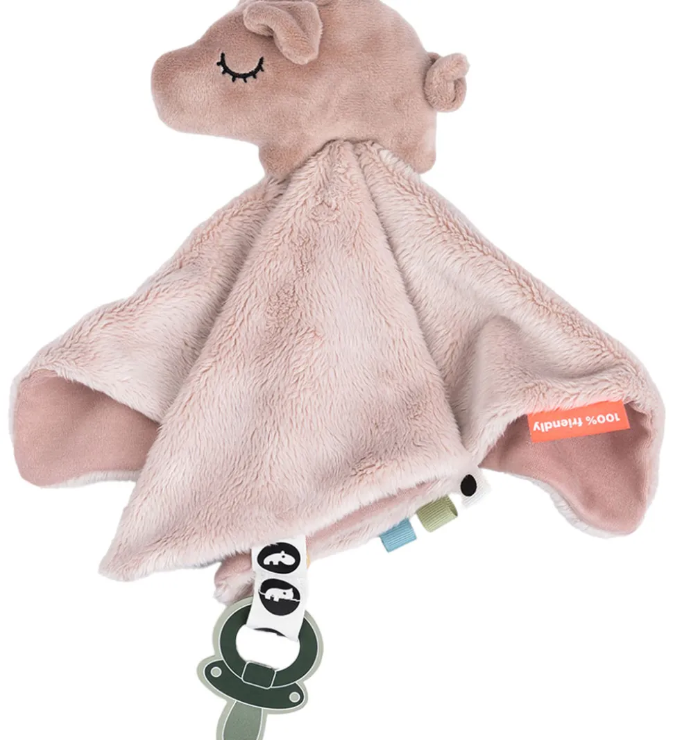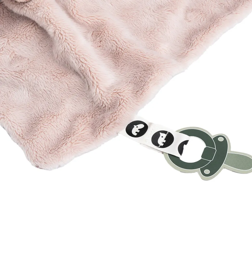 Skøn Done by Deer nusseklud med en forside af pudder teedyfleece og en bagside i rosa tekstil. Nussekluden har en firkantet form med et grissehoved i midten, med flotte broderede øjne.