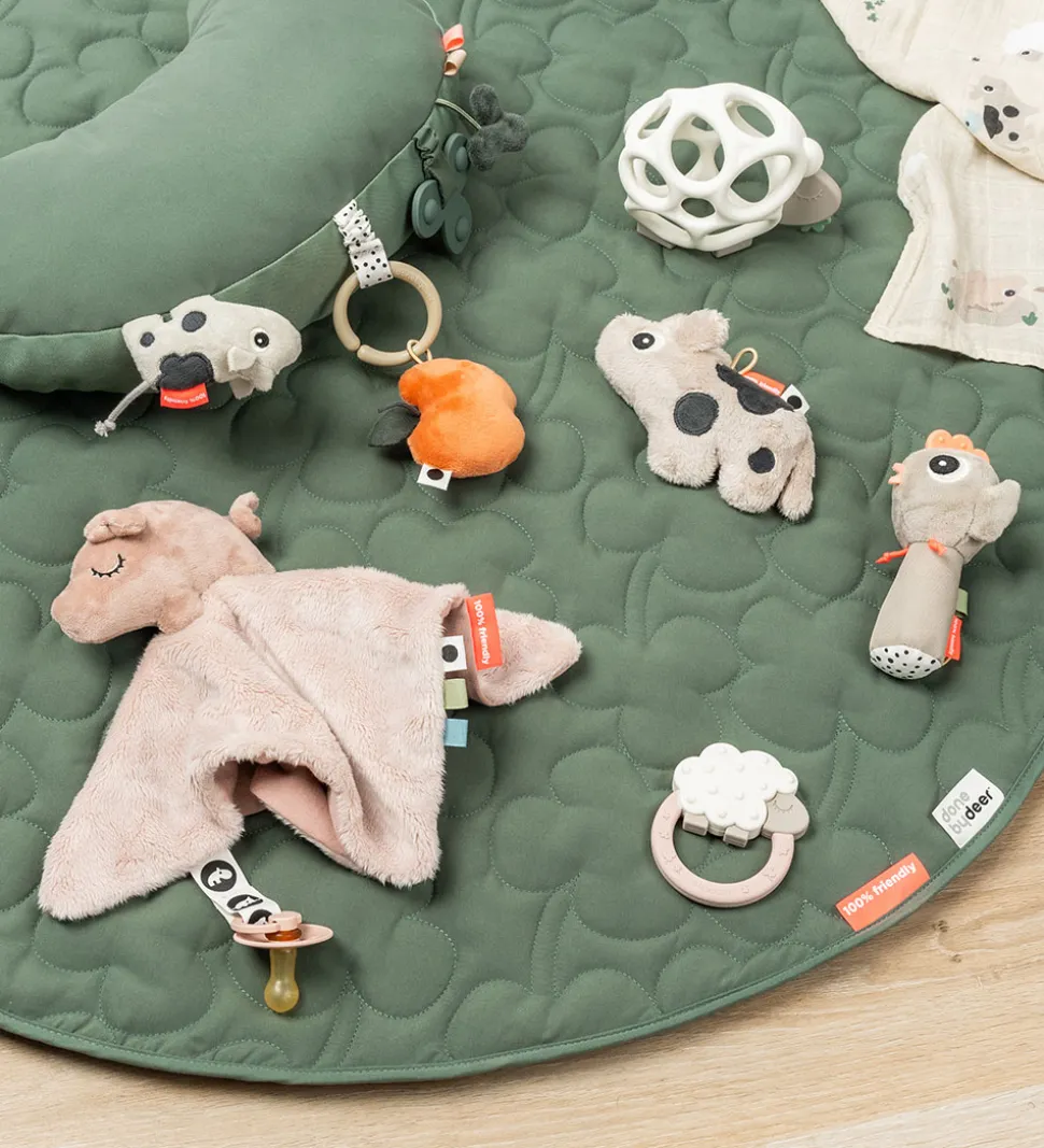 Done by Deer nussekluden fungerer som en sovebamse eller sutteklud, men kan også bruges til at tørre munden med, hvis barnet har gylpet. I en af kanterne forskellige stropper barnet kan udforske, og i den ene side er der en praktisk velcrostrop til sutten.