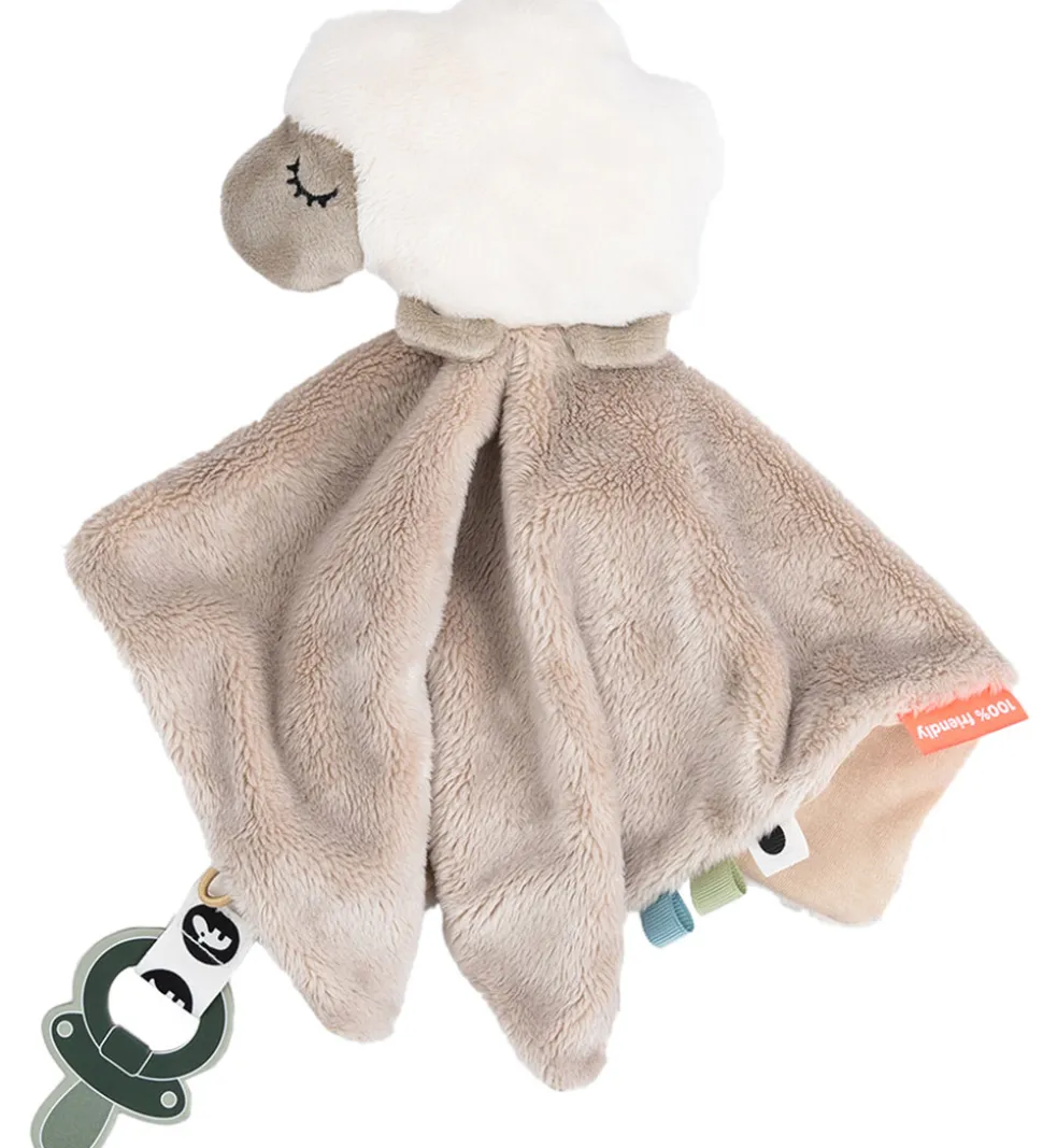 Done By Deer nussekluden består af to lag, og der er forskellige hanke og stofstykker i to af siderne samt en velcrostrop, man kan bruge til at hænge en sut fast i. Nussekludens dejlige materiale gør den perfekt som sovedyr, sutteklud og meget andet.