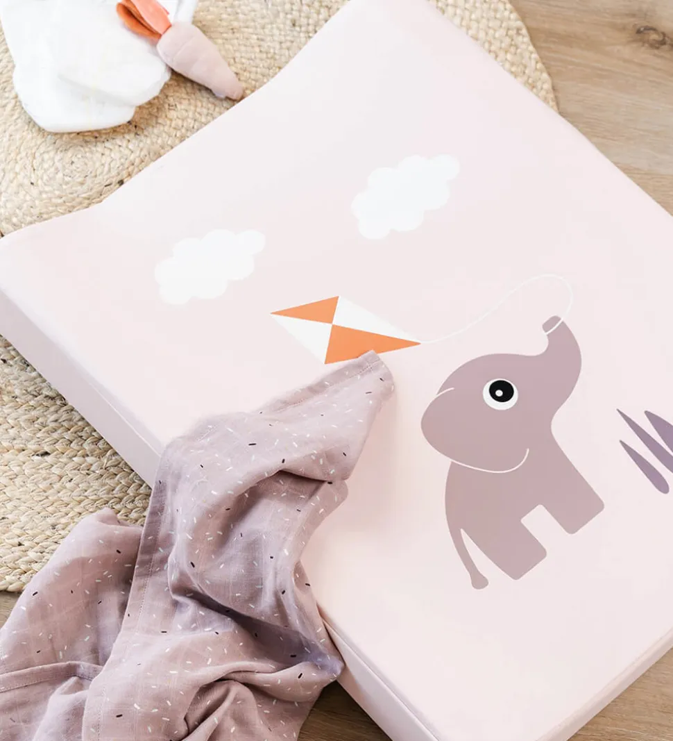 Skøn Done by Deer puslepude i lys rosa med et print af en elefant med en drage.