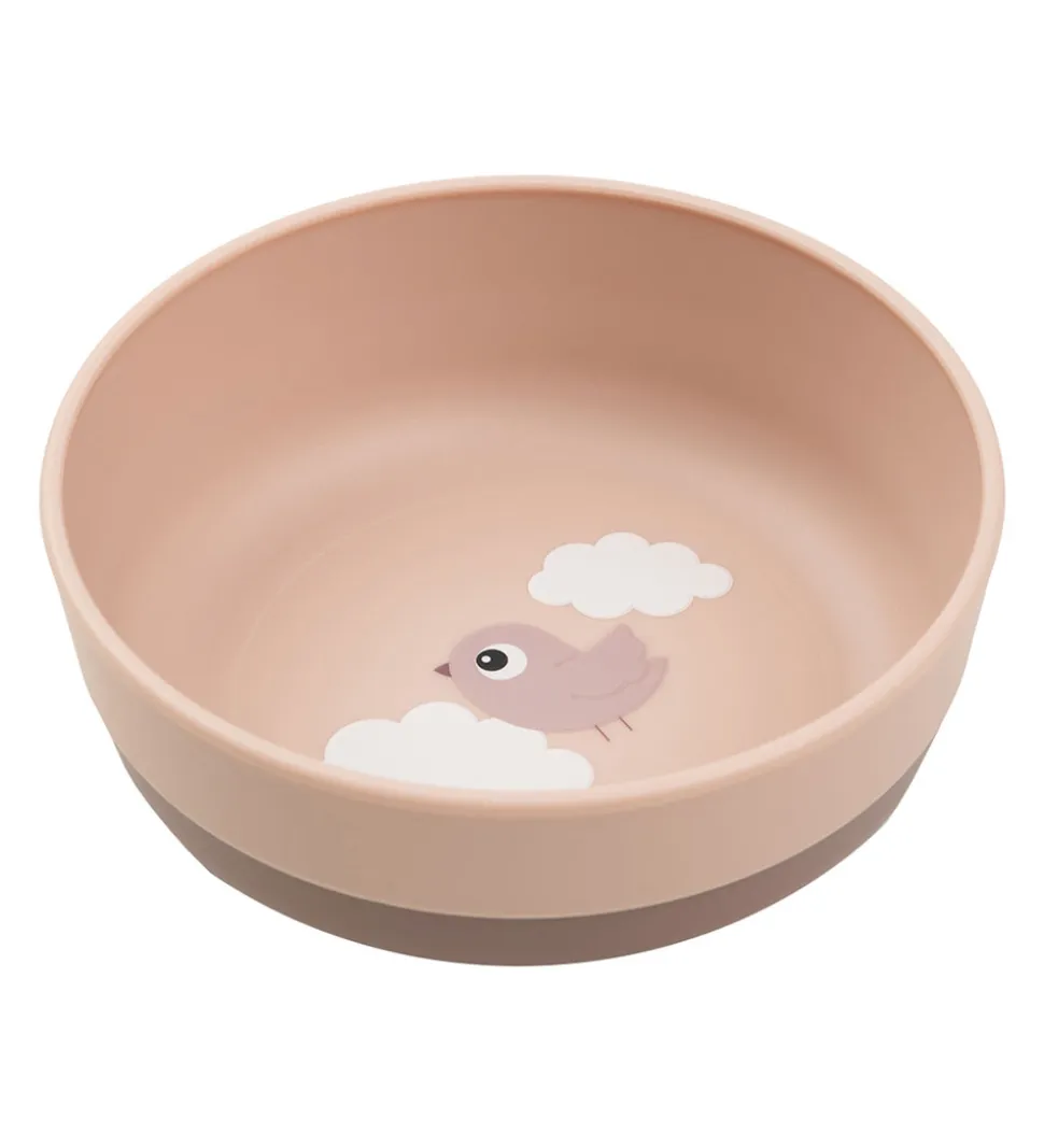 Flot Done by Deer skål i rosa, med en lilla nedre del. Indvendigt er der print af en fugl og skyer.