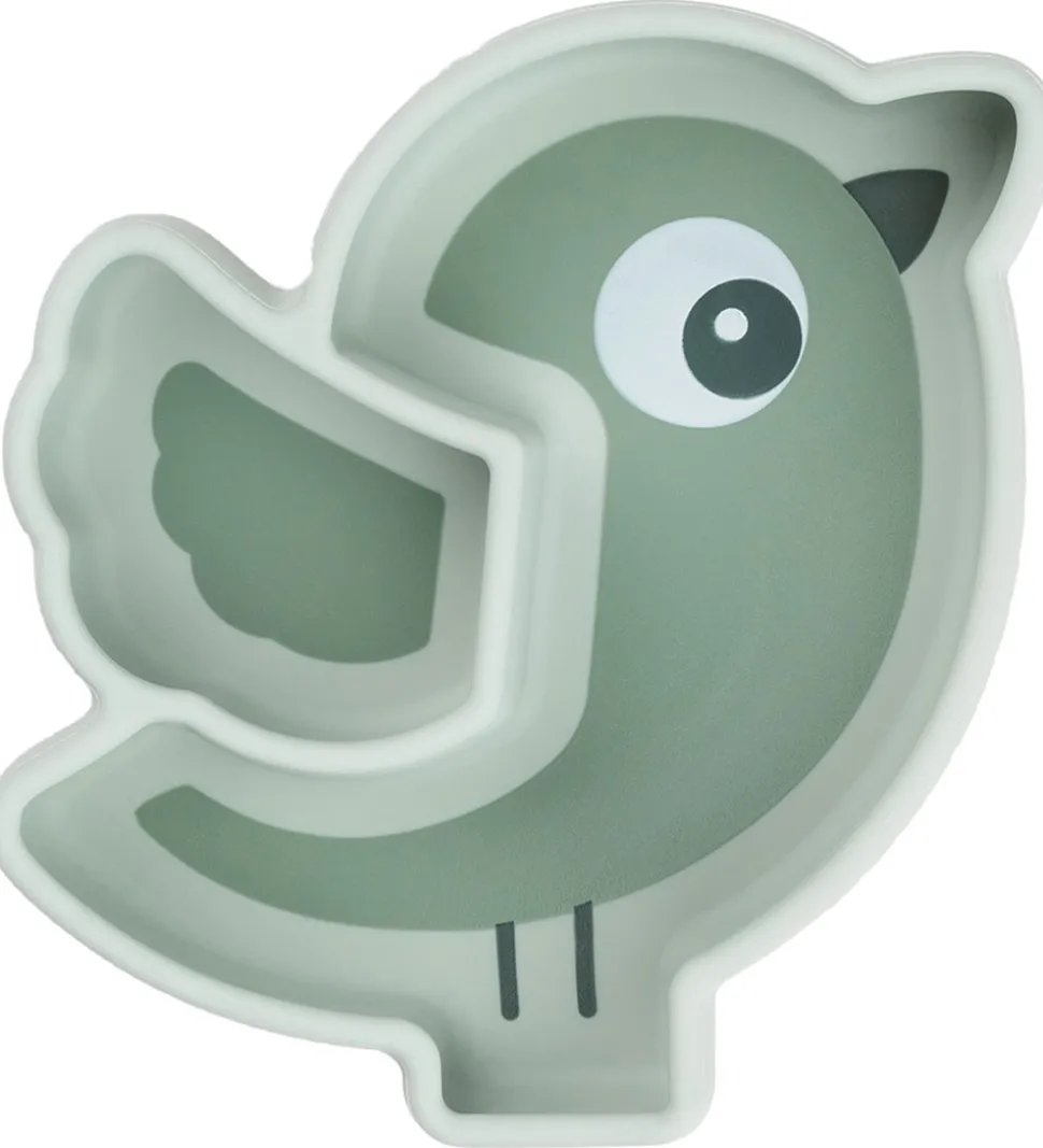 Fin Done By Deer snacktallerken i grøn med form som fuglen “Birdee”. I bunden af tallerkenen er der også et print af dyret.