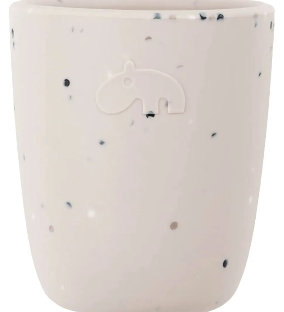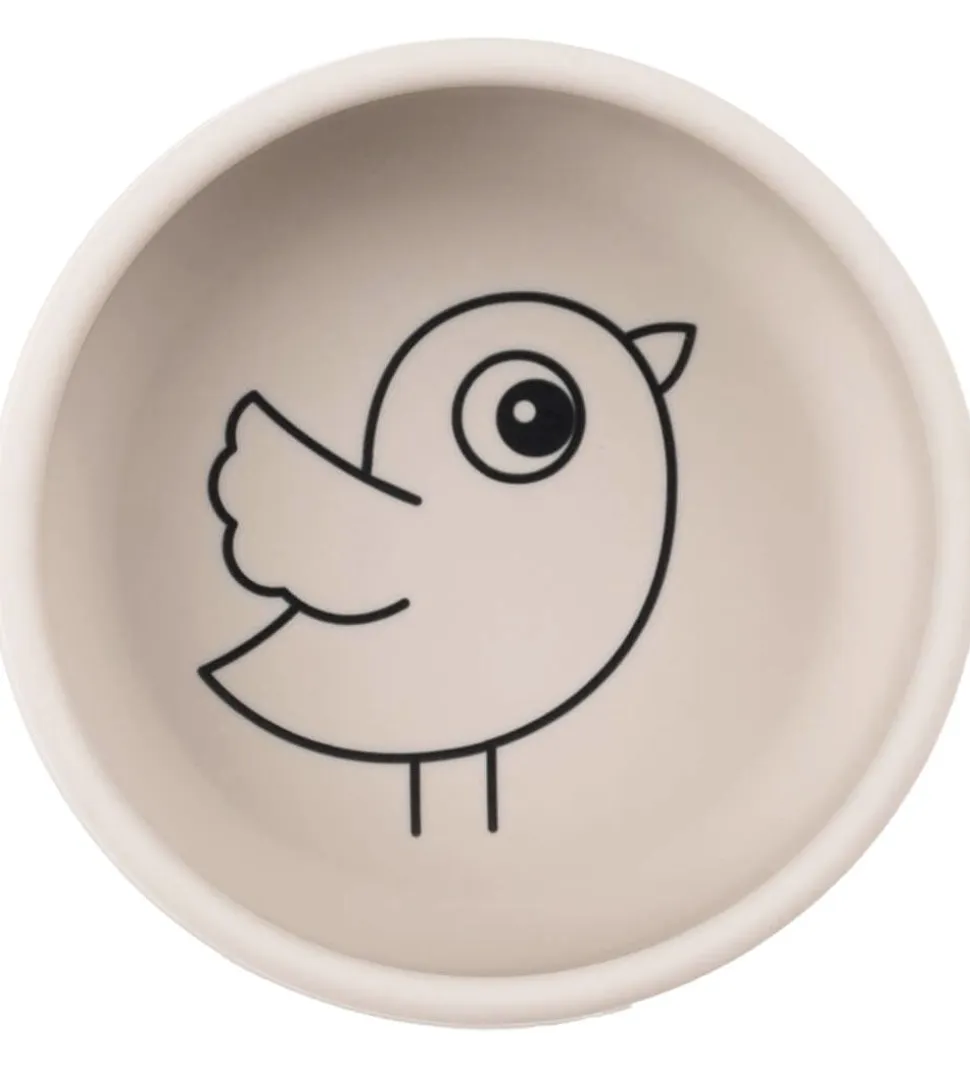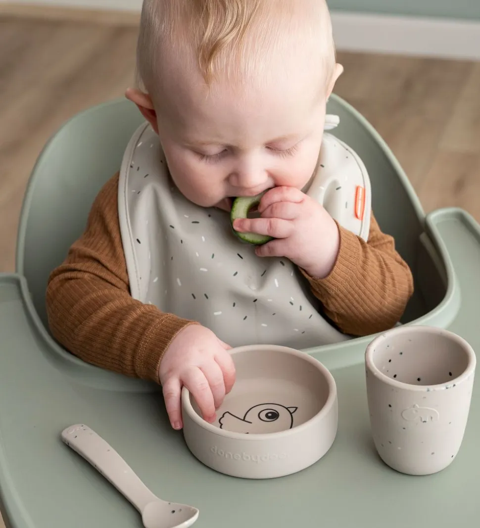 Done By Deer spisesættet består af en skål, en kop og en ske i silikone. Skålen har høje kanter, og i bunden er der et print af en fugl. Koppen har en god form til de små hænder, så de nemt selv kan holde koppen. Skeen har et langt skaft.