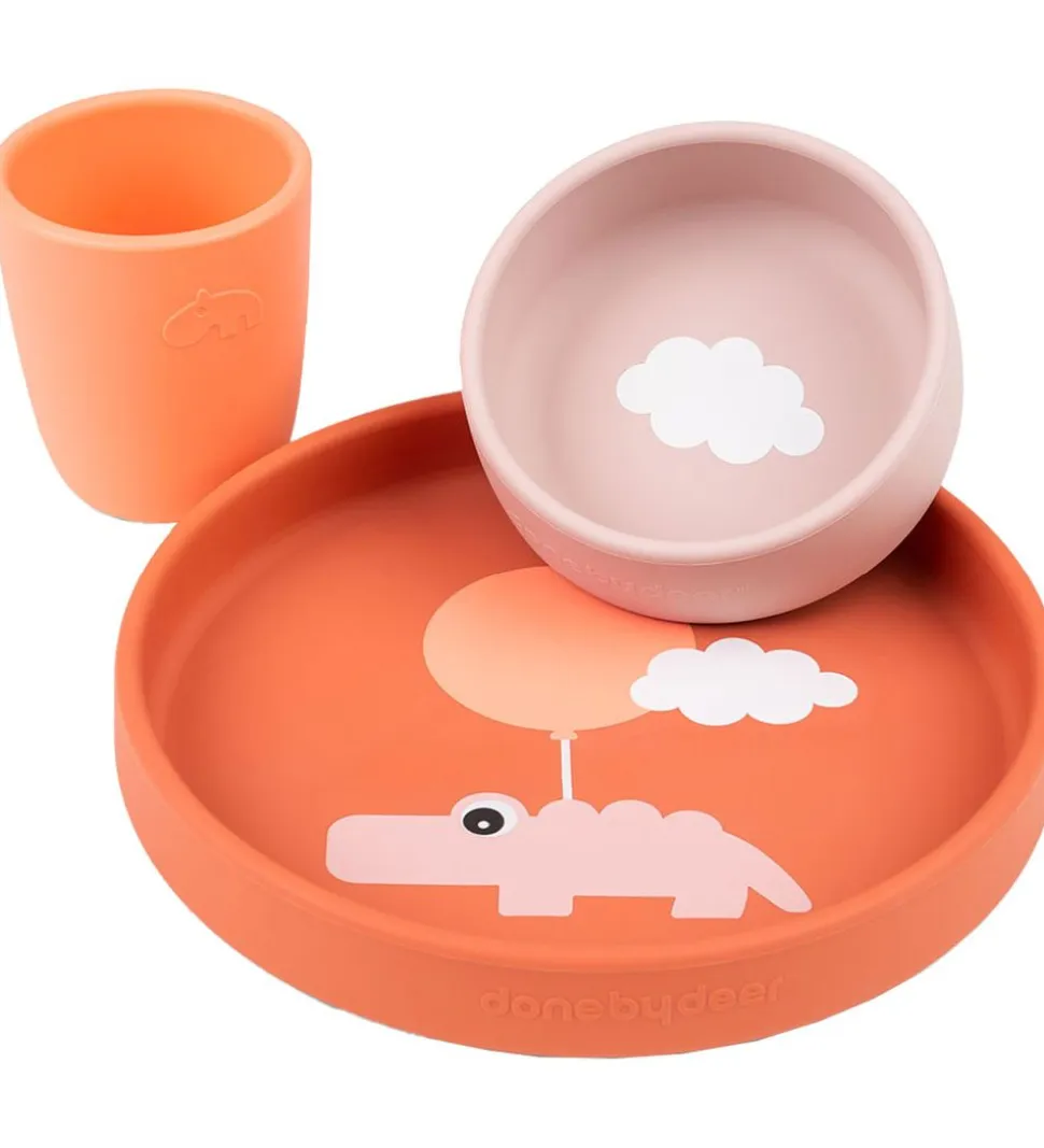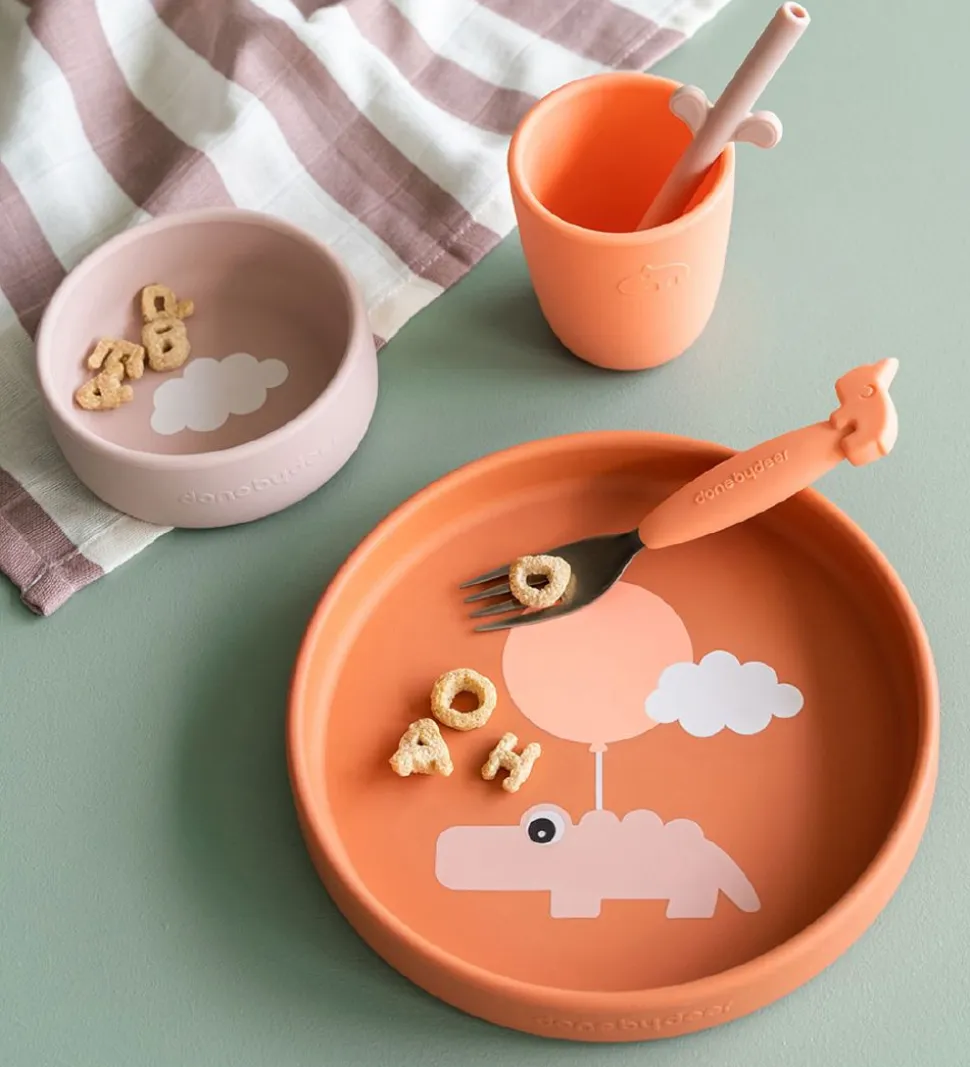 - Tallerkenen er mørk orange med print af en krokodille og en ballon i bunden.