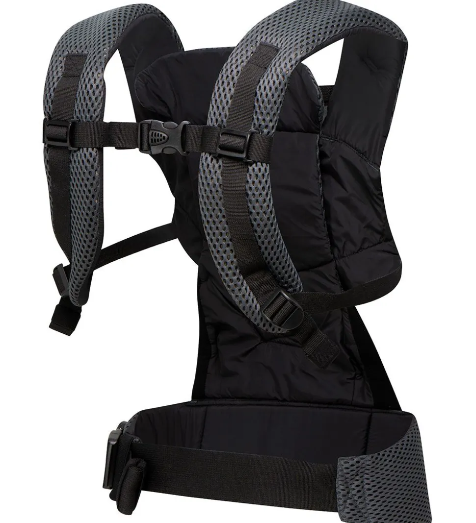 Selen spændes rundt om hofterne med et bredt mavebælte, som lukkes med en bred klikspænde. Skulderstropperne kan justeres i længden, og der medfølger to aftagelige skulderbeskyttere. Bæreselen har et foldbart og justerbart hovedstøtte til babyen.