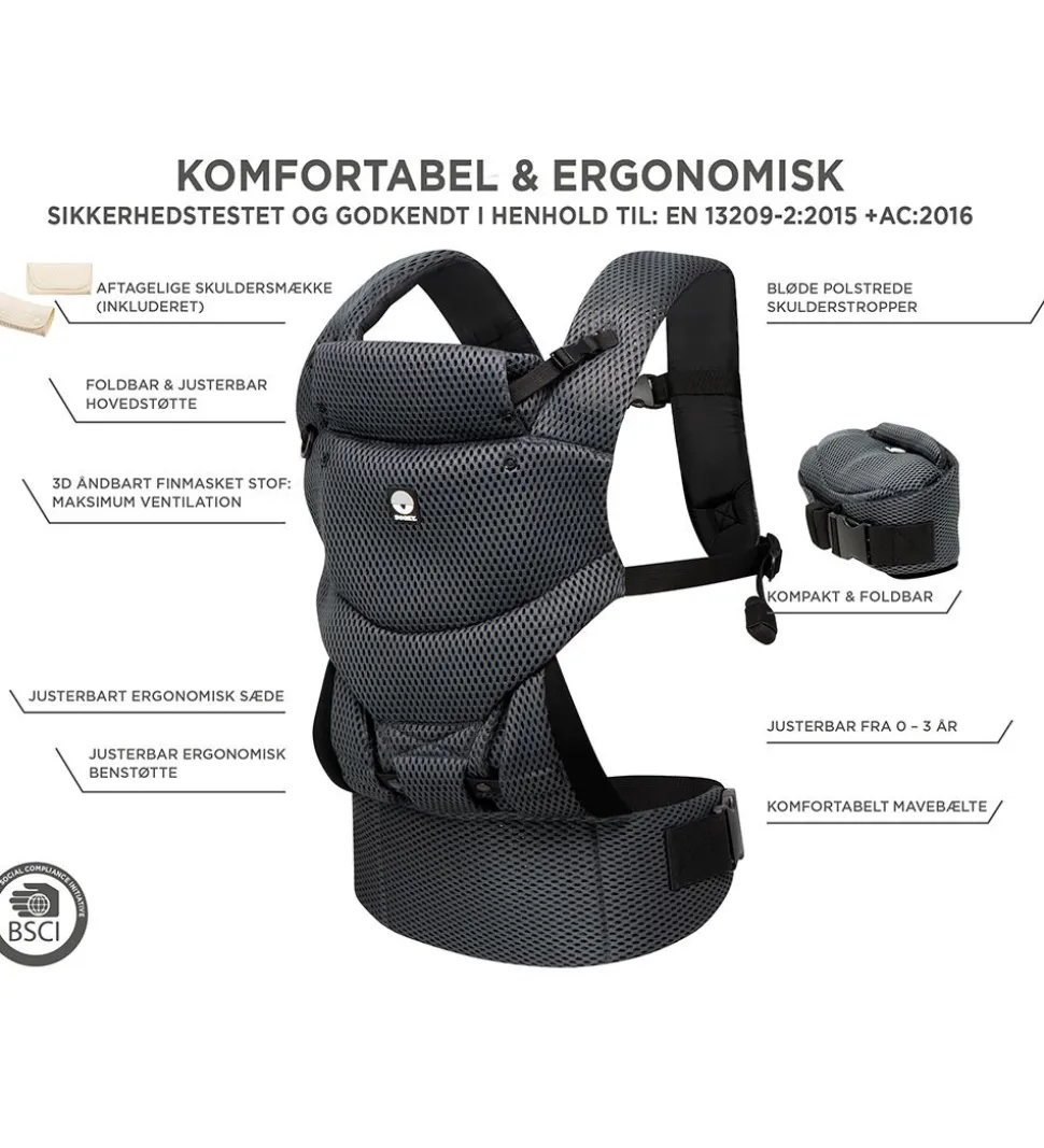 Denne bæresele har gennemgået kvalitets- og sikkerhedsgodkendelser. Den er testet og gokendt ifølge EN 13209-2:2015 + AC2016