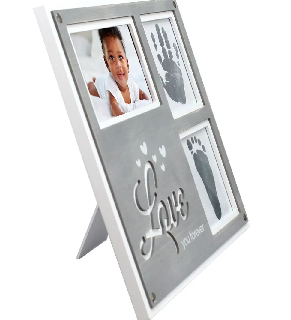 Dooky sættet er lavet så du kan forevige disse minder af din baby. I rammen er der plads til både hånd og fodaftryk i et felt samt to billeder af din baby. I højre side står der “Love you forever” samt nogle hjerter. Dette minde er perfekt til at have hængende i hjemmet eller give som en gave. Sættet laver intet roderi, og er nemt at benytte.