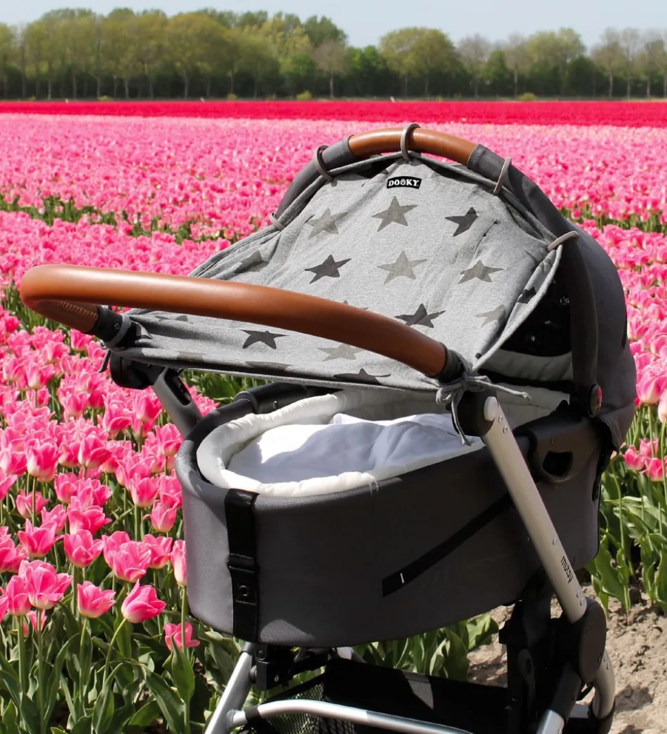 Dooky solsejlet beskytter mod vind, solens UV-stråler, lys, kulde og let regn. Skærmen kan monteres på de fleste barnevogne, klapvogne og autostole med de 5 medfølgende ringe. Solskærmen kan justeres i længden ved at rulle det op eller ned. Solsejlet hjælper også med at holde en behagelig temperatur for barnet inde i vognen.