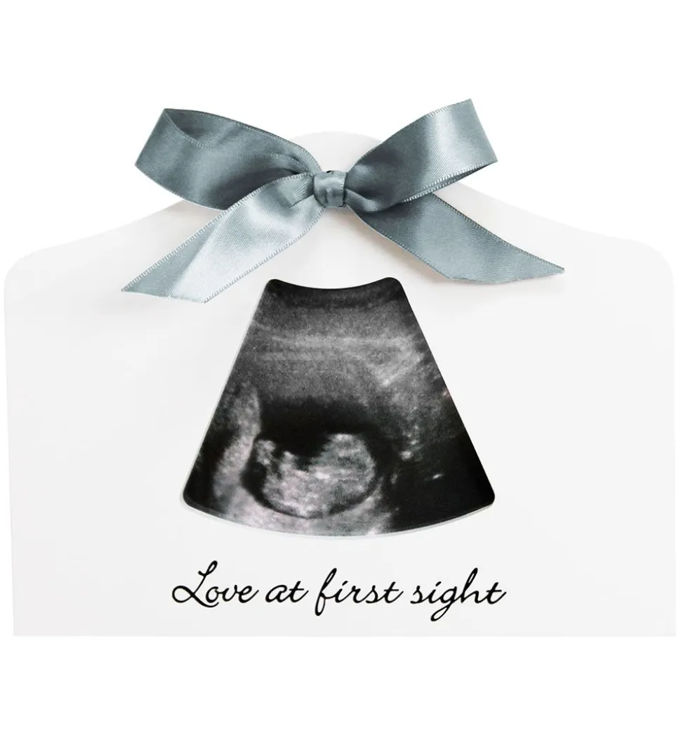 Sød Dooky billedramme i hvid med en blå sløjfe i toppen. I bunden står teksten “Love at first sight” i sort.