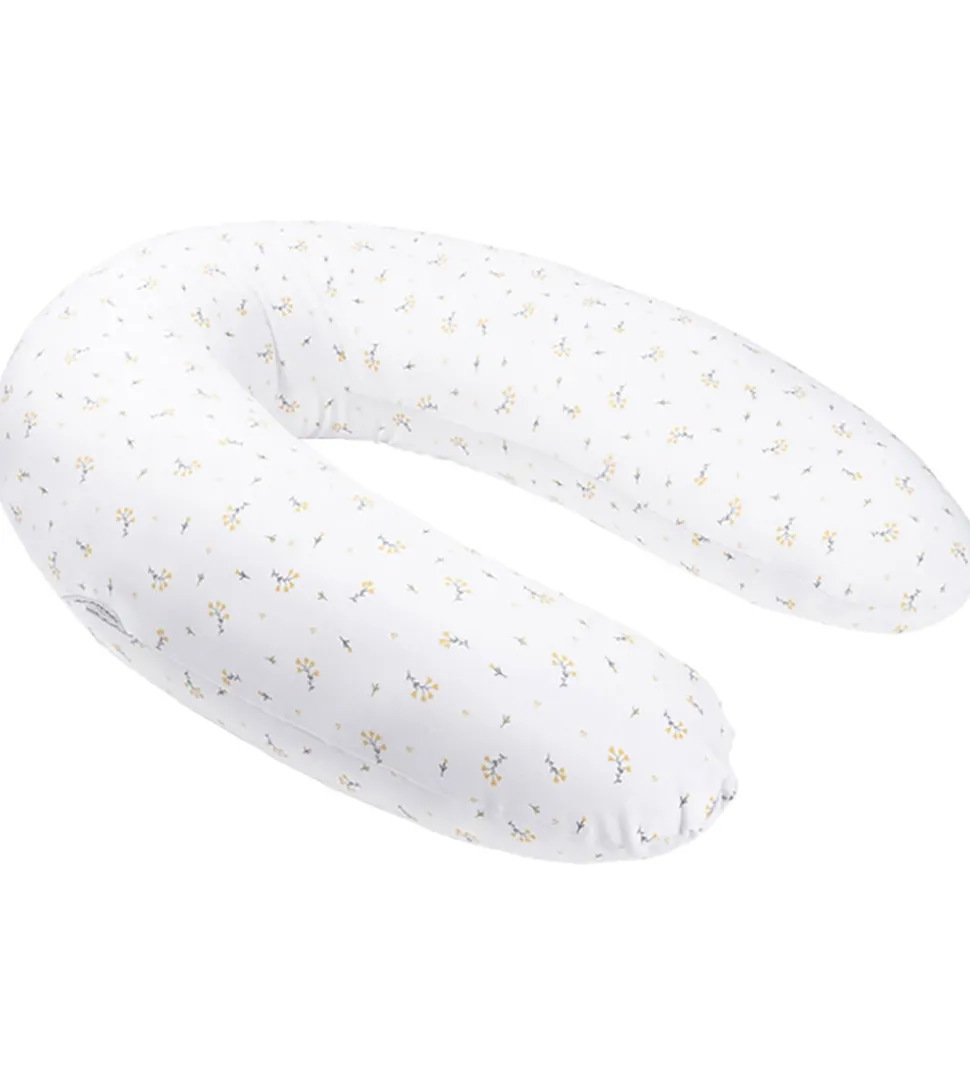 Flot Doomoo graviditets- og ammepude i hvidt bomuldsjersey med et alloverblomsterprint med gule og grønne farver.