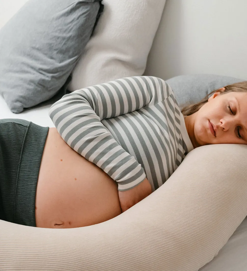 Lækker Doomoo graviditets- og ammepude i en lys sandfarve med fløjlsstruktur på den ene side og glatvævet bomuldsstruktur på den anden side.