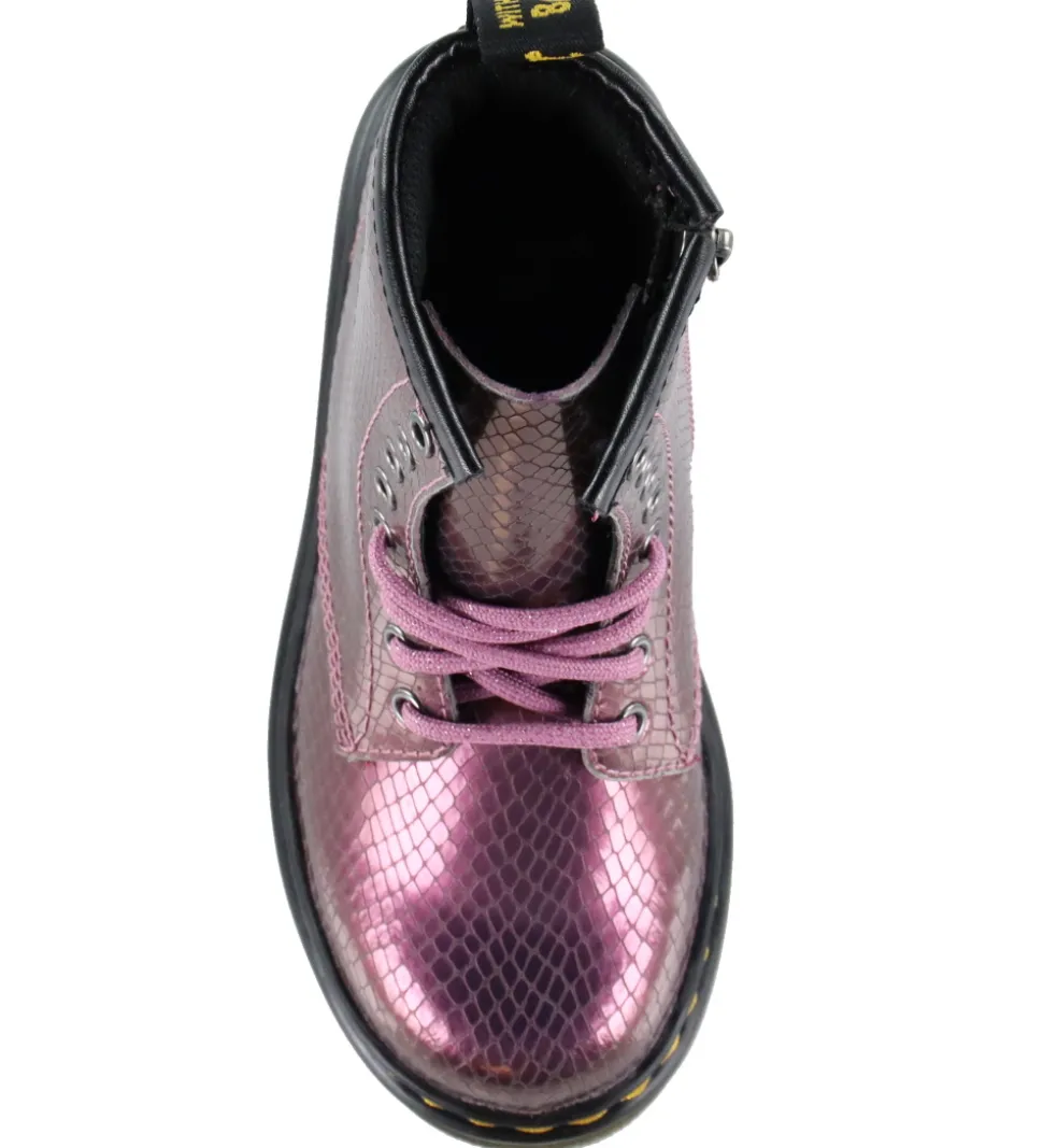 Yndige Dr. Martens støvler i lak med et flot reptilmønster i metallisk lilla.