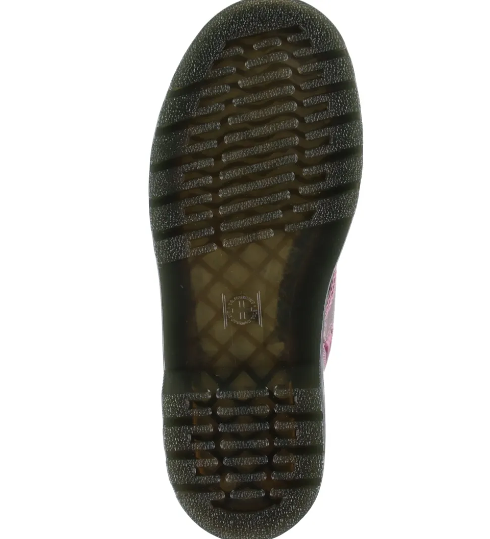 Stilfulde Dr. Martens støvler i lak med et flot reptilmønster i metallisk lilla. Støvlerne har den klassiske gule syning omkring ydersålerne.