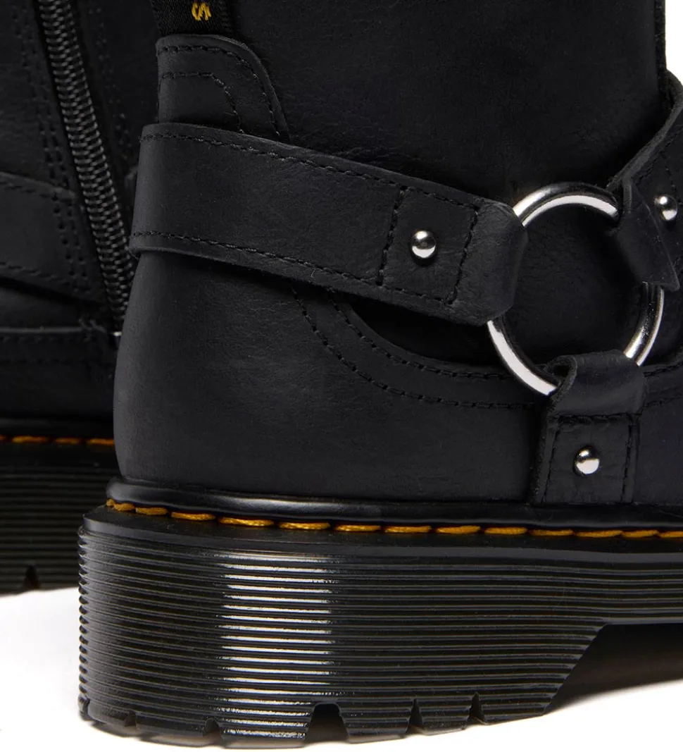 Smarte Dr. Martens støvler i sort læder med smarte remme der samles med en ring på ydersiden. Støvlerne har den karakteristiske gule syning langs ydersålerne.