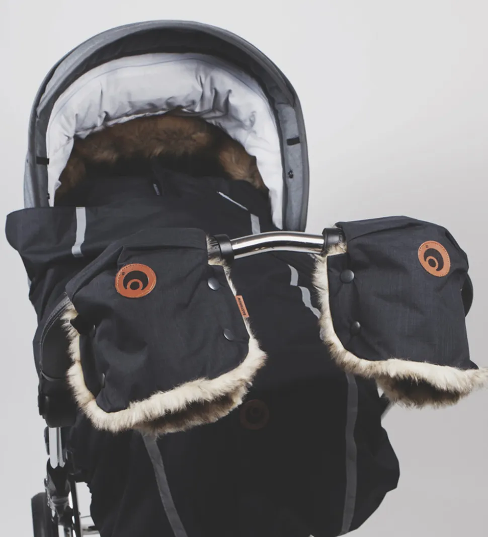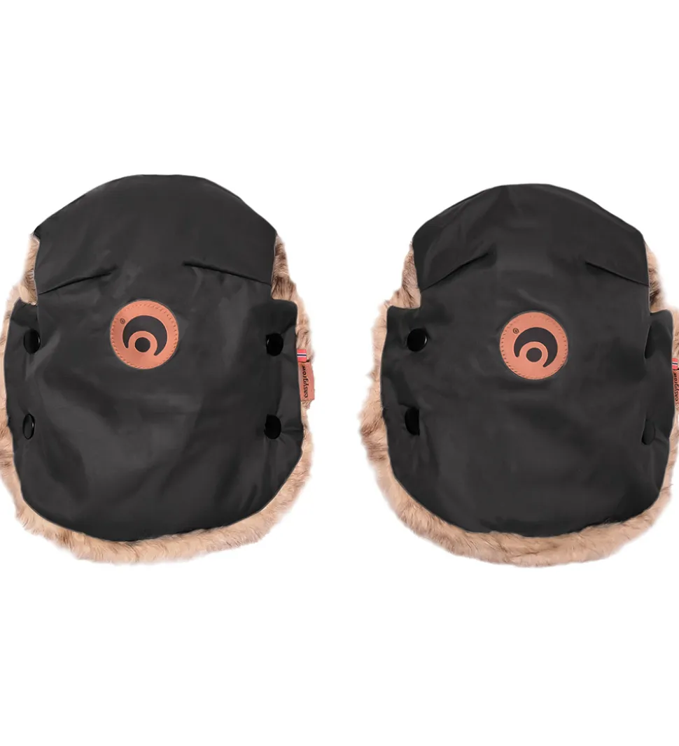 Flotte Easygrow barnevognshandsker i en sort, glatvævet kvalitet på ydersiden med en brun, rund logopatch. Indvendigt har de et for af brunt, imiteret pels.
