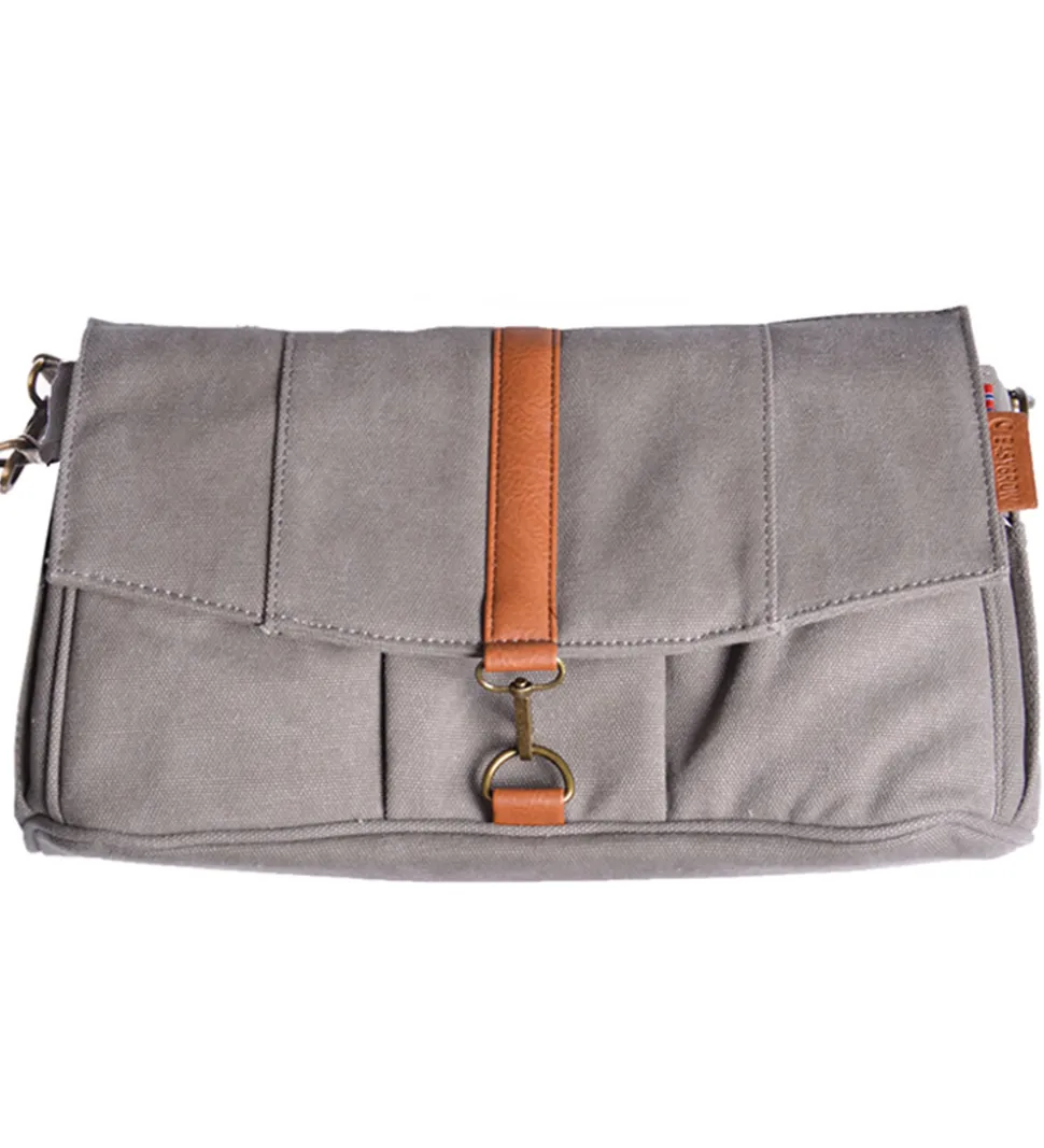 Fin Easygrow barnevognstaske i grå kanvas og med detaljer i brunt, imiteret skind og metal.