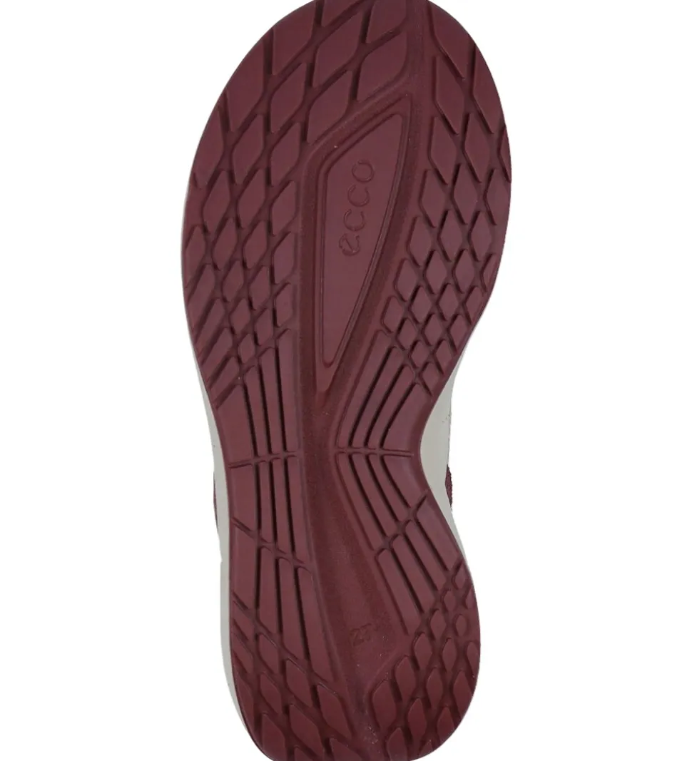 Ecco støvlerne har et kort skaft, som går lige over anklerne. Fortil er der elastiksnøre, som strammes ind med et spænde. Bagtil er der en praktisk strop med refleksdetaljer. Indvendigt er der lilla mesh og udtagelige indersåler. Skoene har letvægtige og fleksible ydersåler med et praktisk mønster under bunden, som sikrer et godt fodfæste.