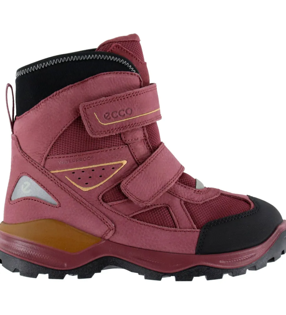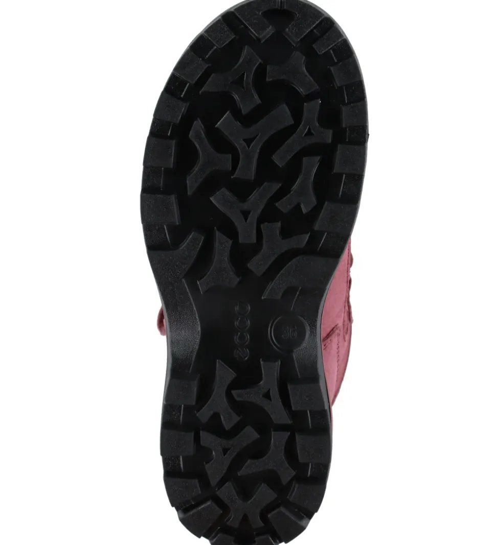 Flotte Ecco vinterstøvler i gammelrosa nubuck og tekstil. Vinterstøvlerne har brune og sorte detaljer samt en refleksdetalje på hælene.