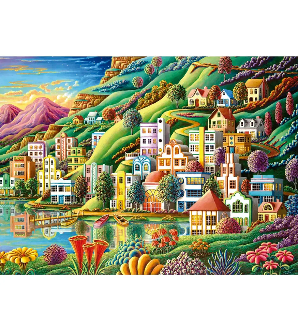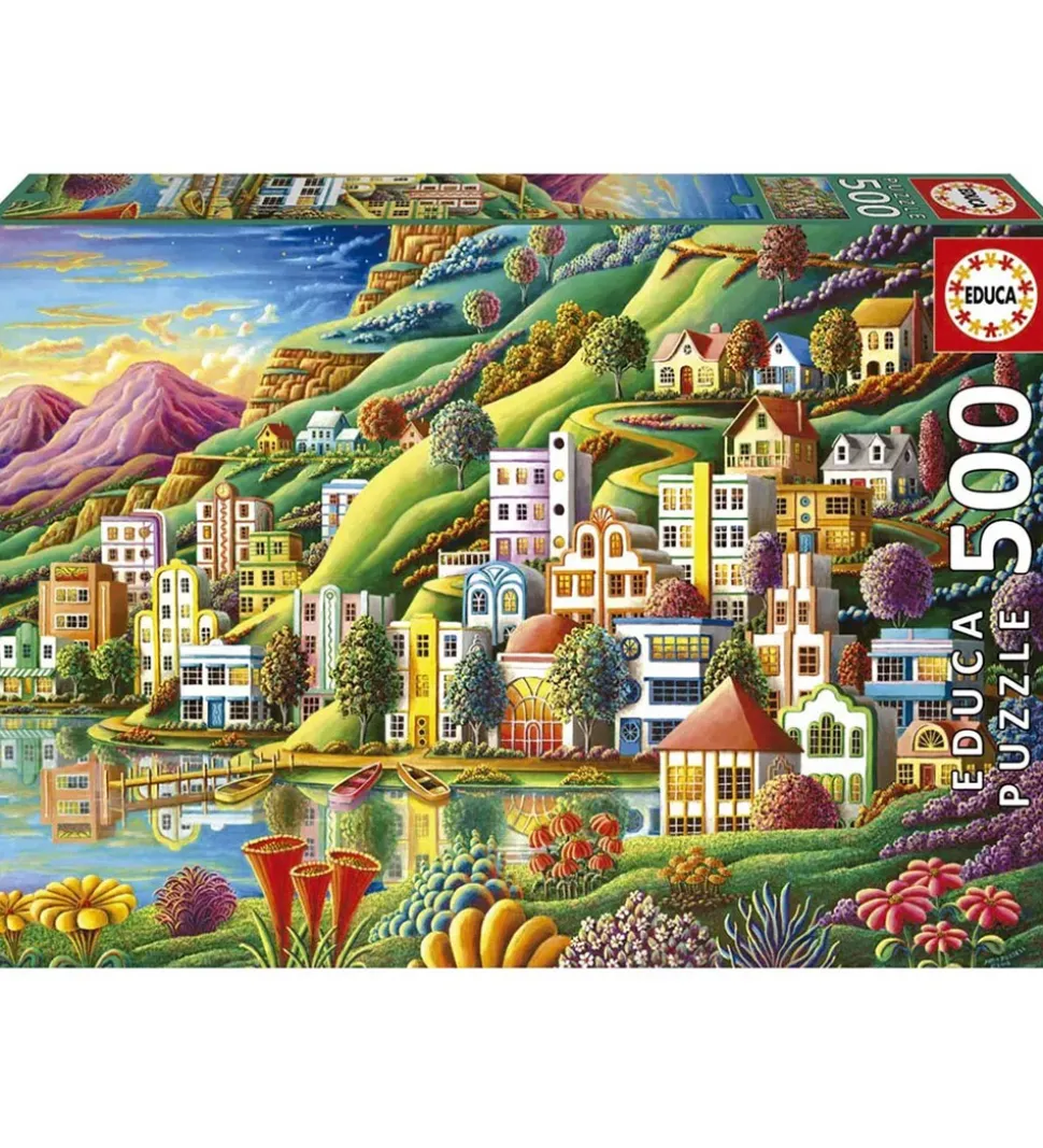 Farverigt Educa puslespil med 500 brikker, der viser en betagende natur- og byscene i primært grønne og gule nuancer. Educa puslespillet byder på mange detaljer og flotte landskaber, der stimulerer kreativitet og koncentration.