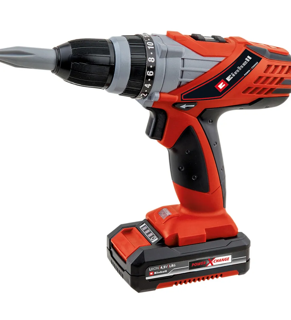 Smart Einhell værktøjskasse med en boremaskine i rød, sort og grå. Der medfølger fire forskellige bit/bore-replikaer, og et udskifteligt batteri, som passer til alt Einhell værktøj.