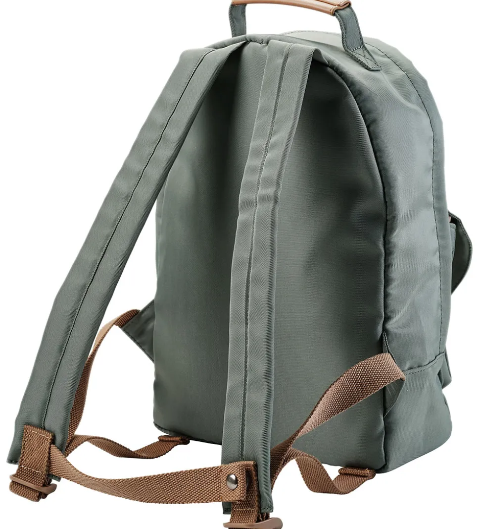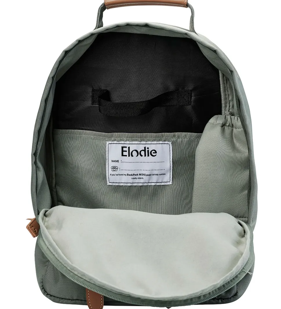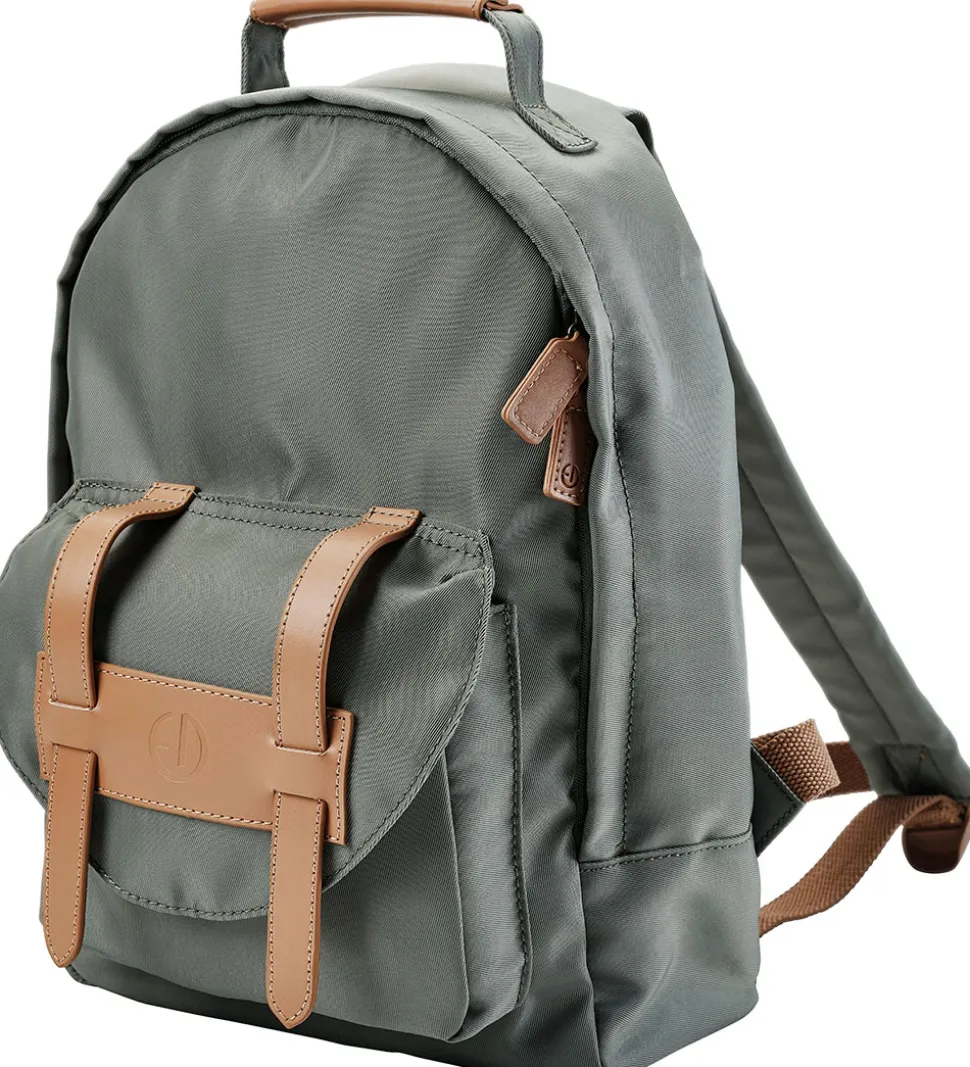 Dejlig Elodie Details børnehavetaske i støvet grøn. Børnehavetasken har remme, vedhæng og detaljer i brunt, imiteret læder.