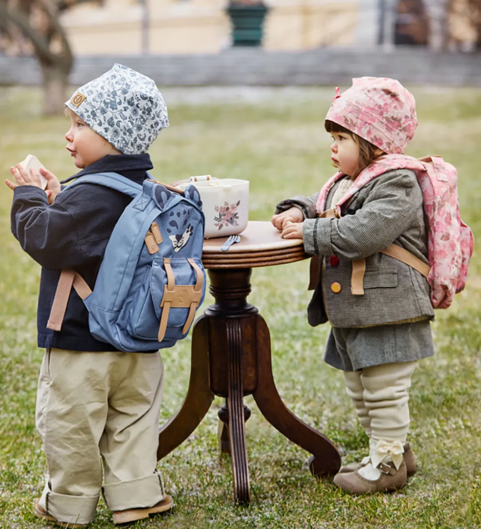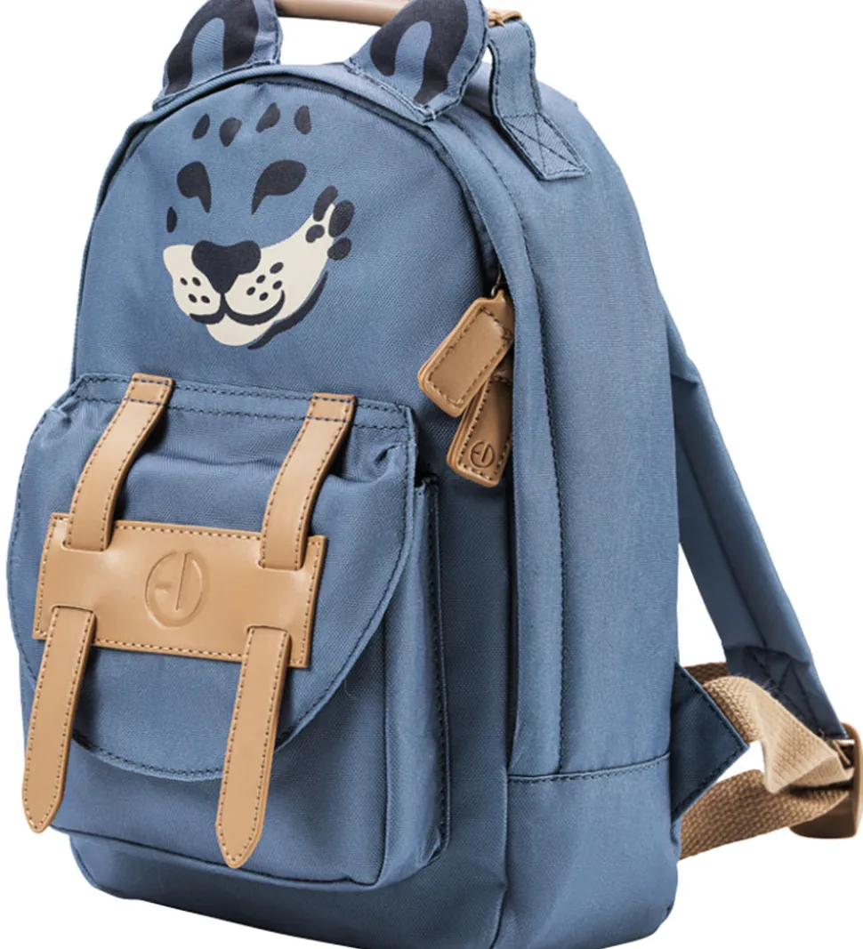 Fin Elodie Details børnehavetaske i blå, og fortil er der et print med en leopard i sort og hvid.