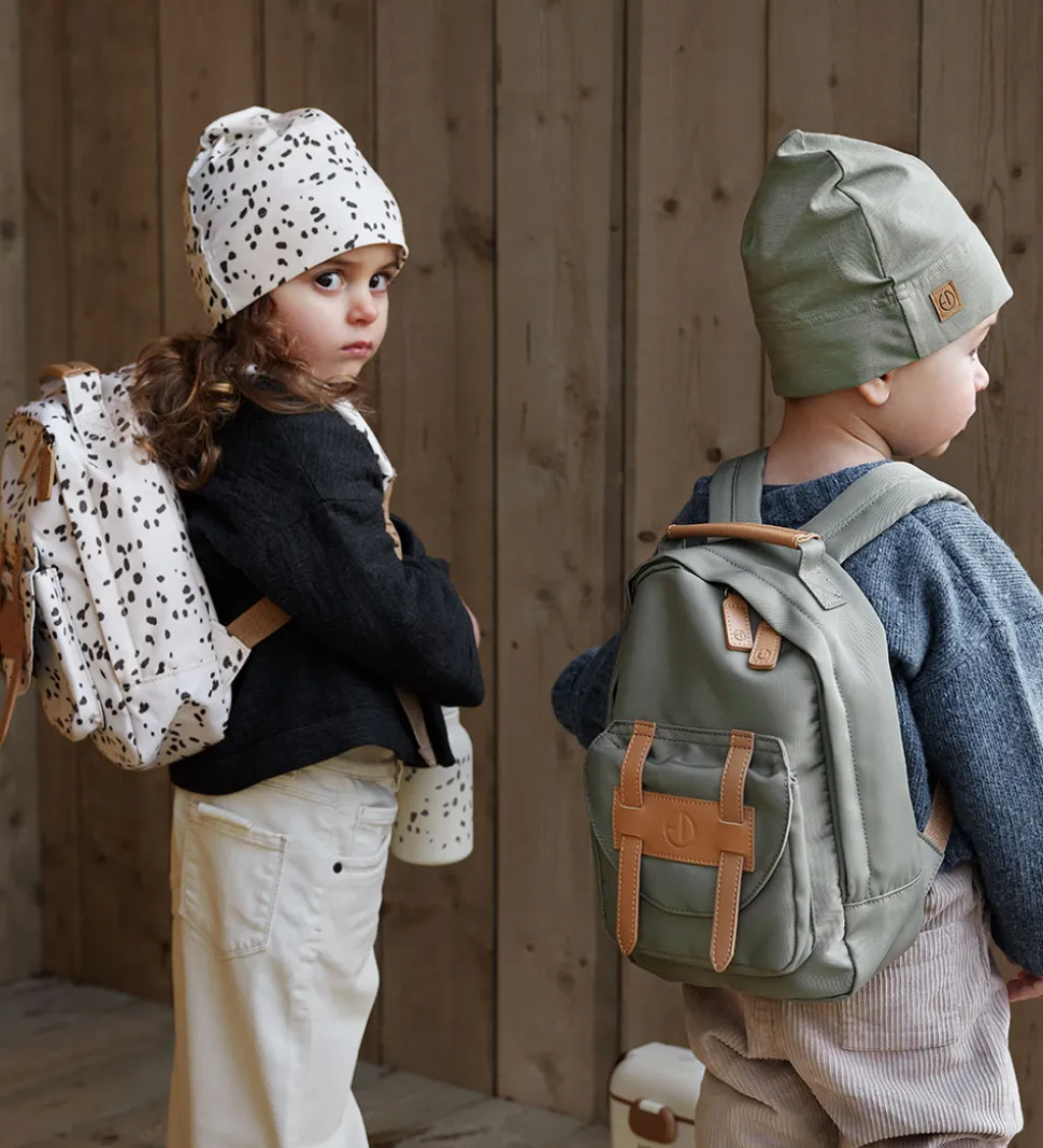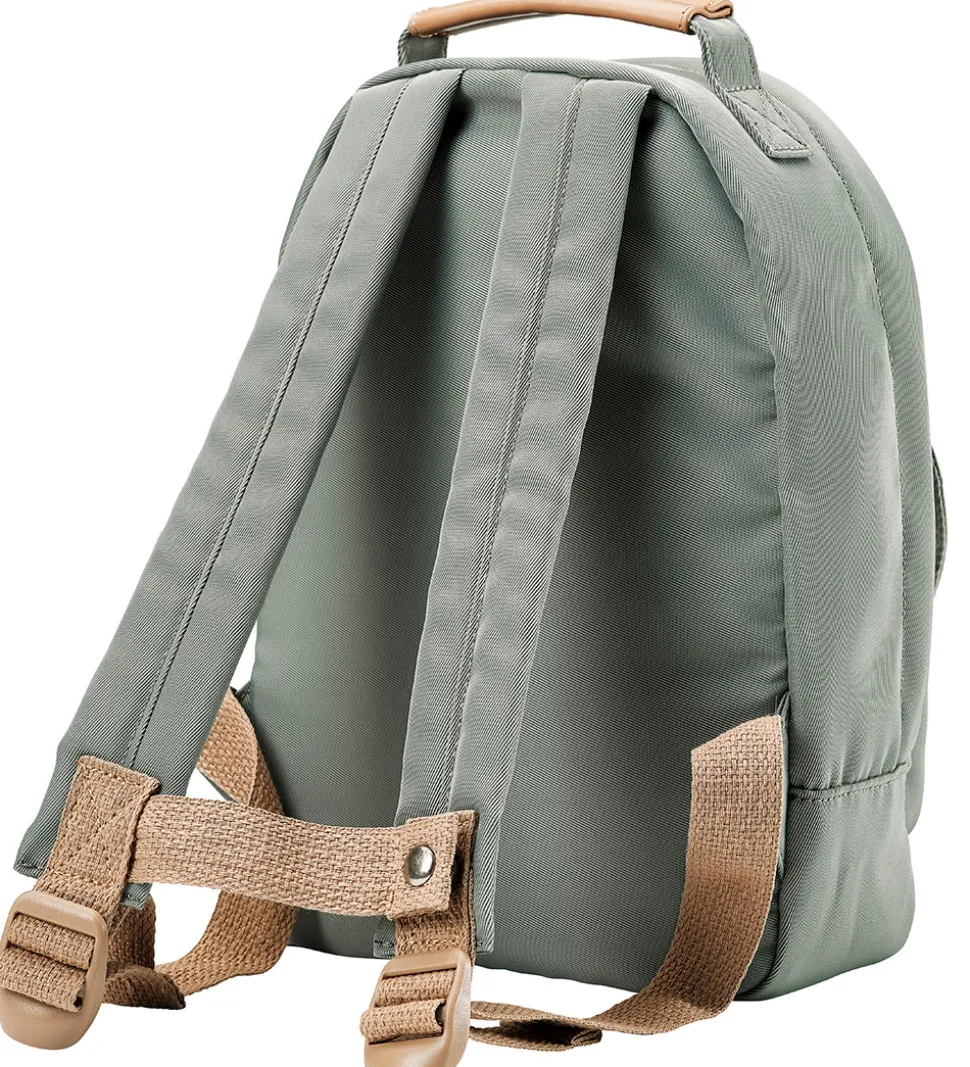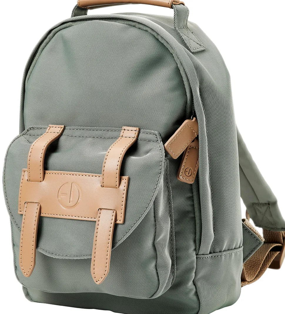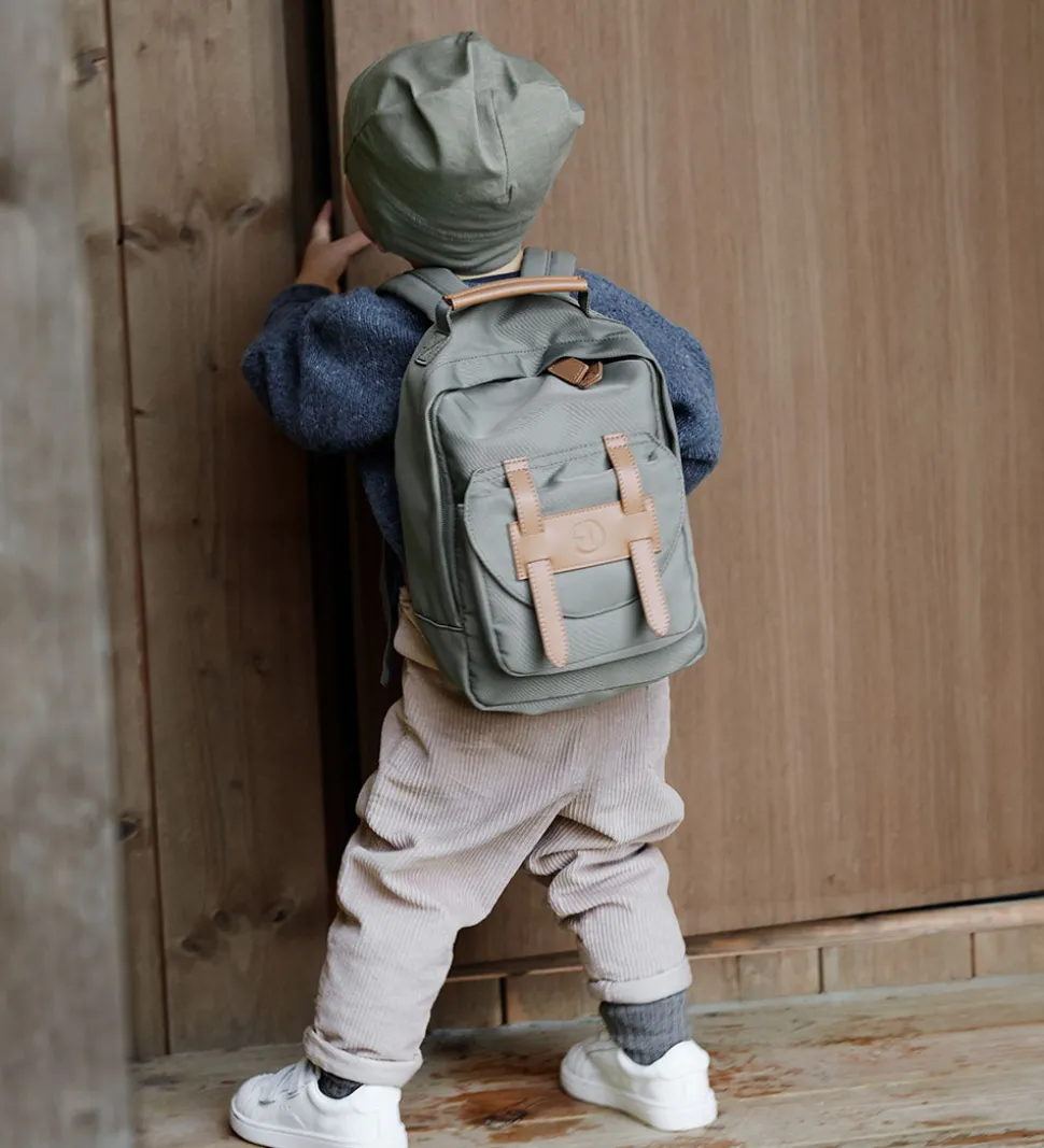 Dejlig Elodie Details børnehavetaske i støvet grøn. Børnehavetasken har remme, vedhæng og detaljer i brunt, imiteret læder.