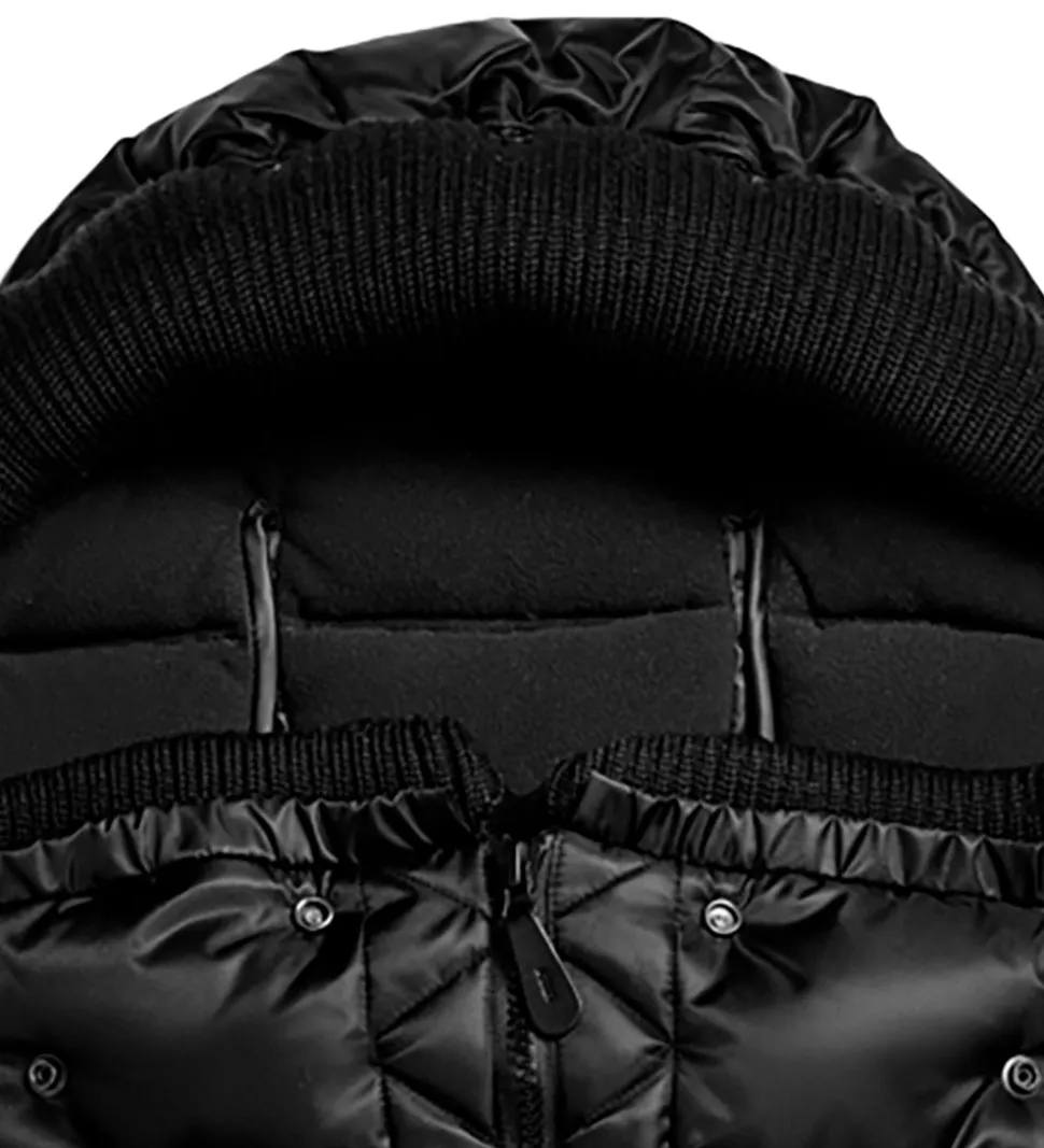På hættens yderside har køreposen et ombuk der kan sættes omkring klapvognens top for at forhindre at posen glider ned. Selve hætten har en aftagelig, justerbar strikrave som sidder fast med elastik og knap. Derudover har den en indsyet elastik i kanten så den enten kan sættes omkring klapvognen eller beskytte barnet i koldt vejr. I køreposens ryg er der smarte velcro-åbninger til barnevognsseler, og hullerne er dækket af praktiske flapper der beskytter imod kulde.