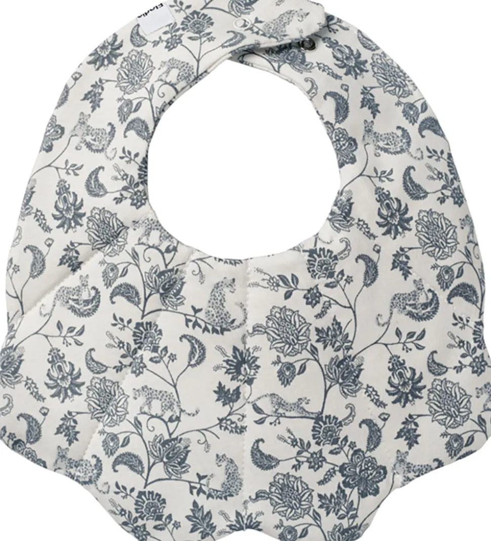 Praktisk Elodie Details savlesmæk i hvid med et detaljeret print i gråblå og med en bølget facon nederst. Hagesmækken lukkes med en trykknap i nakken med to indstillinger.