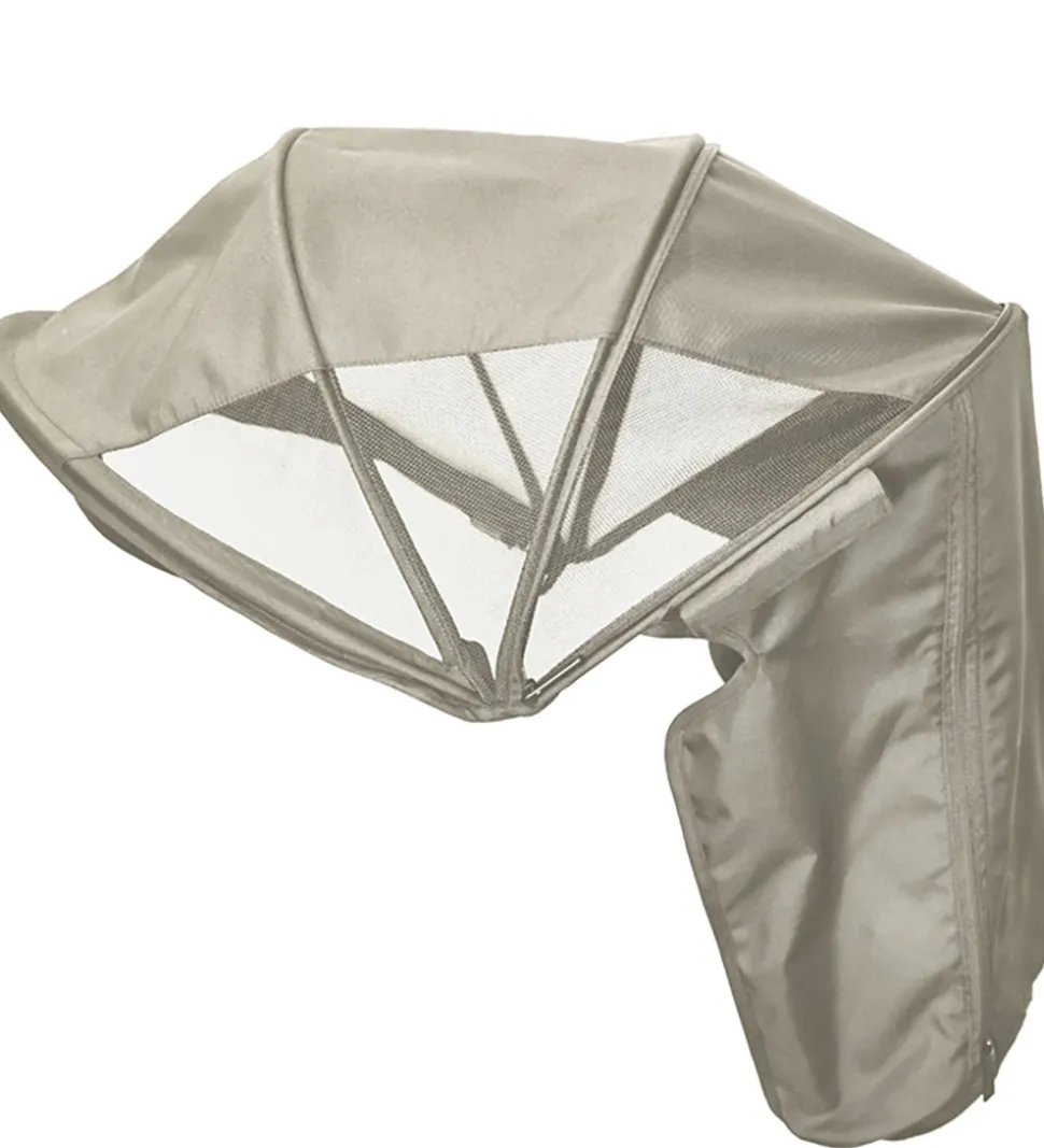 Smart Elodie Details solskærm til klapvogn i en flot beige nuance med netdetaljer i siderne og bagtil. Nettet giver god ventilation og bagtil kan man folde det midterste stykke ned og lyne til, så der kun er net i siderne. Solskærmens længde kan justeres ved hjælp af en lynlås. Solskærmen er let at sætte på og tage af, og den passer til alle Elodie Mondo klapbogne.