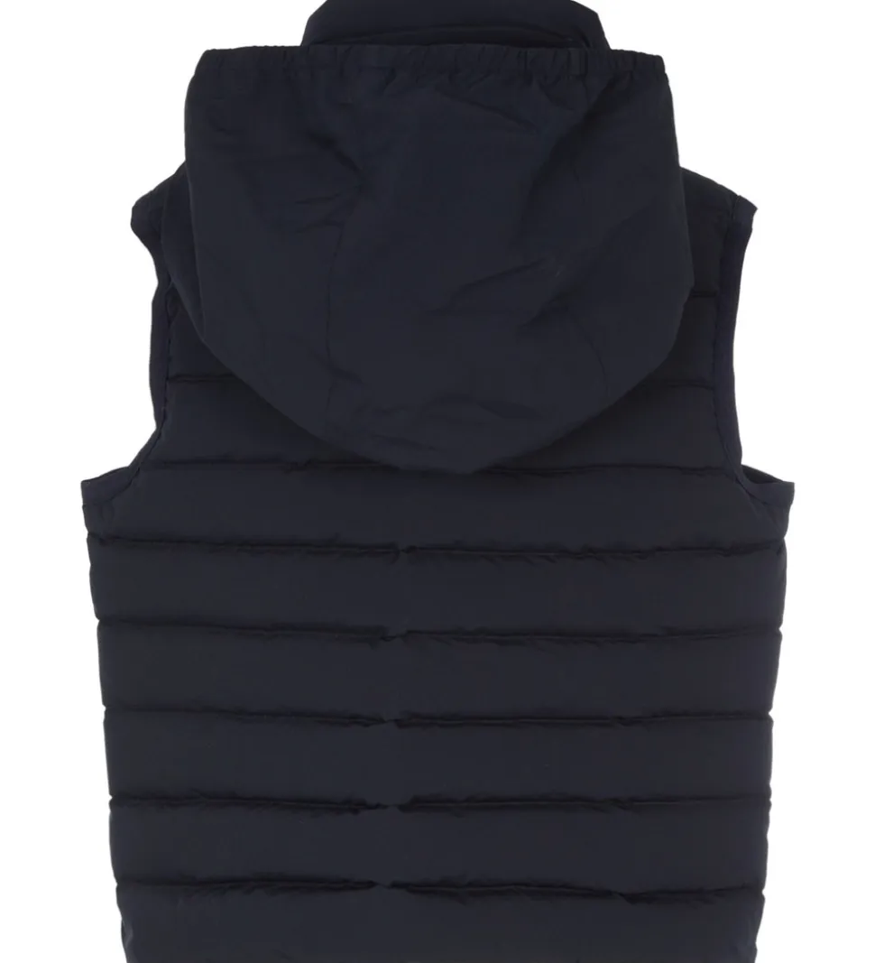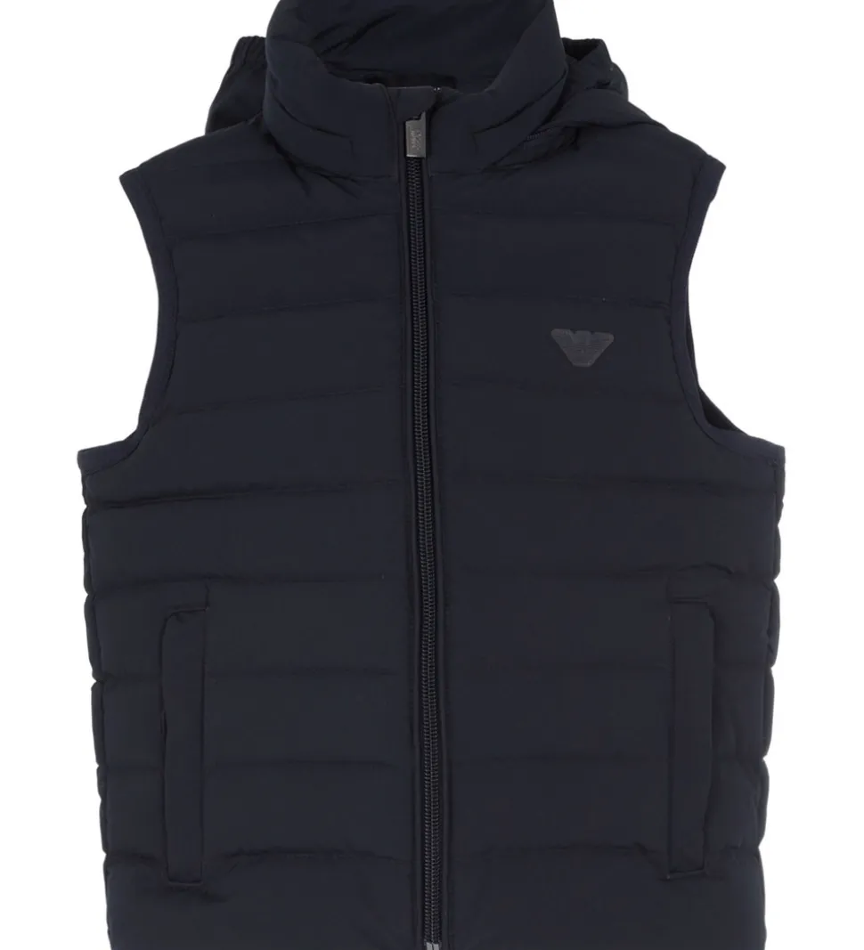 Emporio Armani dunvesten har en fast hætte, som kan gemmes væk i en lynlåslomme i kraven. Dunvesten har en høj hals, og ærmegabene har smalle, elastiske kanter. Dunvesten åbnes med en lynlås med hagebeskytter og indvendig vindstolpe, og i siderne er der fleeceforede lommer, som lukkes med en skjult trykknap. Duvesten har et glatvævet for, og den har en let vattering med genanvendte dun, så den egner sig godt som overtøj i overgangsmånederne.