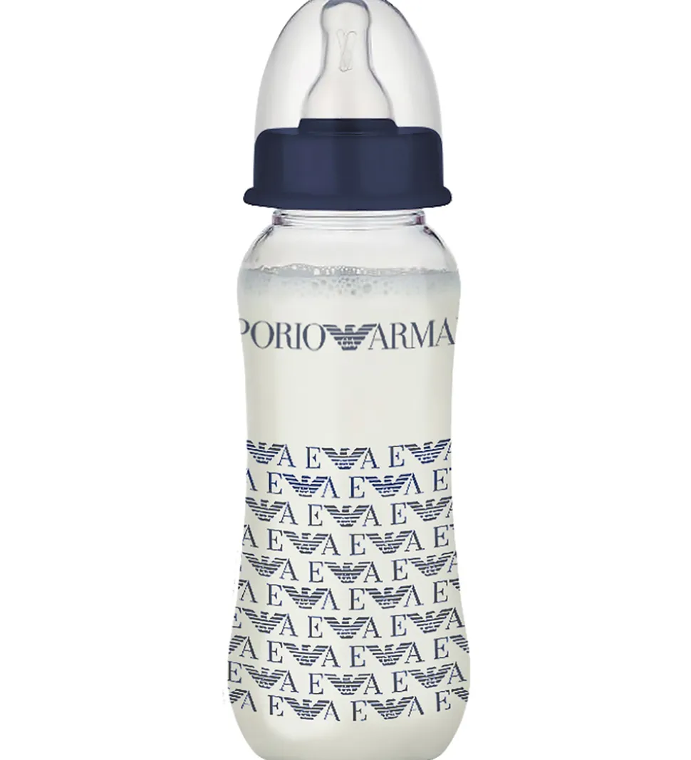 Flot Emporio Armani sutteflaske af gennemsigtigt plast med et navy mønster på flasken med Armani-logoer, og skruelåget er navy.