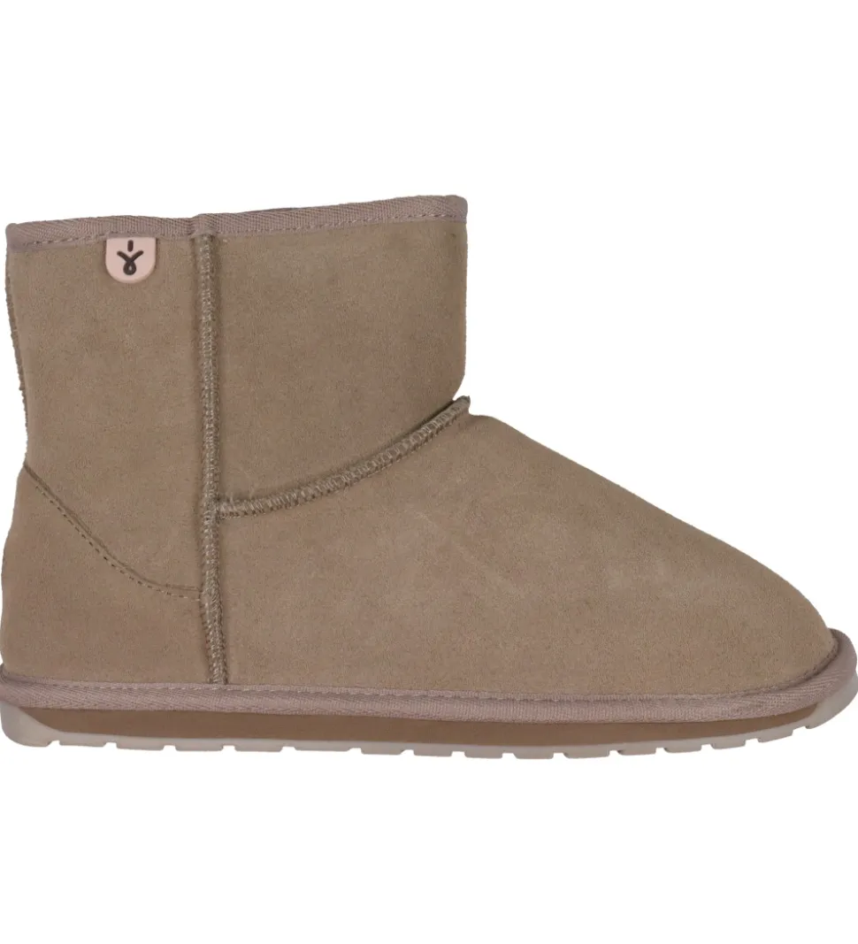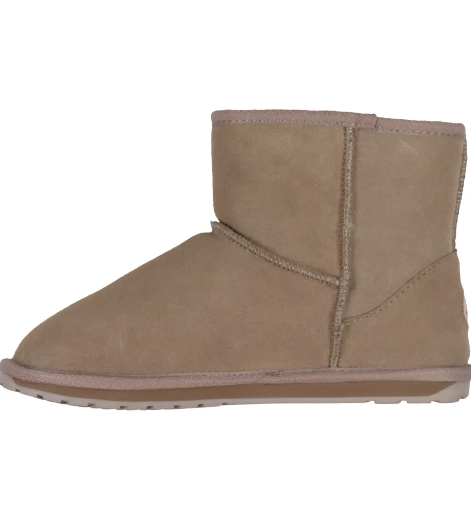 Fine EMU Australia bamsestøvler i ensfarvet beige ruskind med dekorative syninger.