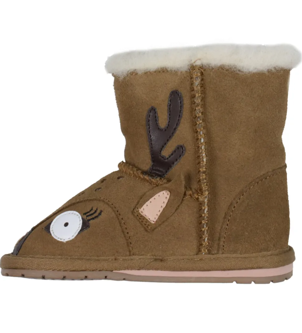 Fine EMU Australia bamsestøvler i brunt ruskind, og på foden er den dekoreret som en sød hjort.