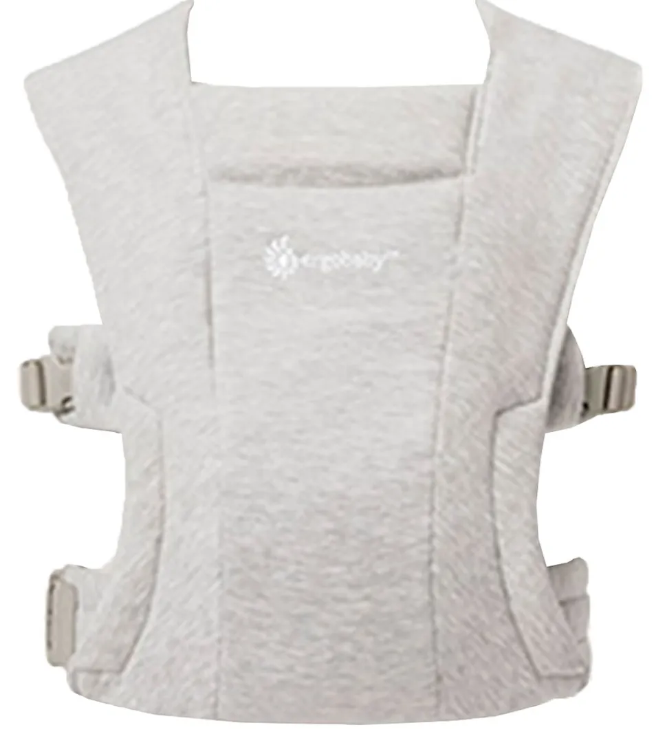 Skøn Ergobaby bæresele i meleret lysegrå med et hvidt, broderet logo.