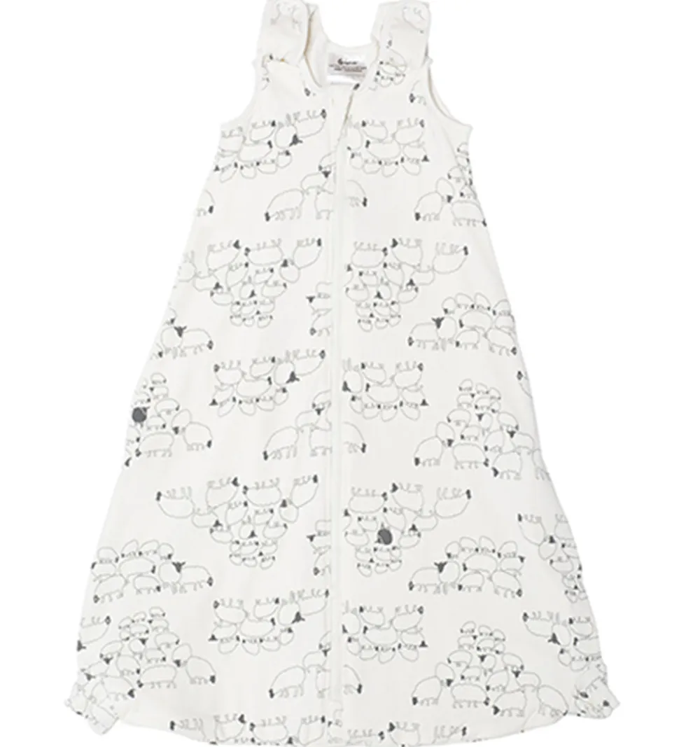 Praktisk Ergobaby sovepose i hvid med et gråt print af fine får.