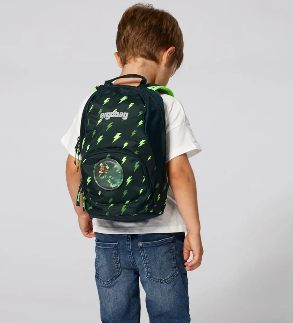 Sej Ergobag børnehavetaske i sort neongrønne og armygrønne lyn. Der medfølger et velcromærke med et motiv af en superhelt.