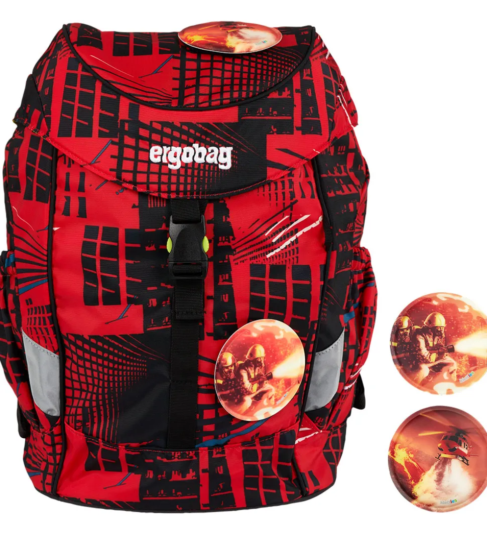 Flot Ergobag børnehavetaske i med et rødt og sort alloverprint. Der medfølger 2 velcromærker med motiver med brandbekæmper-tema.
